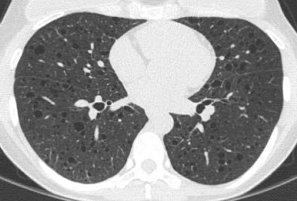 Diffuse cystic lung diseases are uncommon but can present a diagnostic challenge because increasing number of diseases have been associated with this presentation. Cyst in the lung is defined as a round parenchymal lucency with a well-defined thin wall (<2 mm thickness). Focal or multifocal cystic lesions include blebs, bullae, pneumatoceles, congenital cystic lesions, traumatic lesions, and several infectious processes such as coccidioidomycosis, Pneumocystis jiroveci pneumonia, and hydatid disease. “Diffuse” distribution in the lung implies involvement of all lobes. Diffuse lung involvement with cystic lesions can be seen in pulmonary lymphangioleiomyomatosis, pulmonary Langerhans’ cell histiocytosis, lymphoid interstitial pneumonia, Birt-Hogg-Dubé syndrome, amyloidosis, light chain deposition disease, honeycomb lung associated with advanced fibrosis, and several other rare causes including metastatic disease. High-resolution computed tomography of the chest helps define morphologic features of the lung lesions as well as their distribution and associated features such as intrathoracic lymphadenopathy. Correlating the tempo of the disease process and clinical context with chest imaging findings serve as important clues to defining the underlying nature of the cystic lung disease and guide diagnostic evaluation as well as management.
