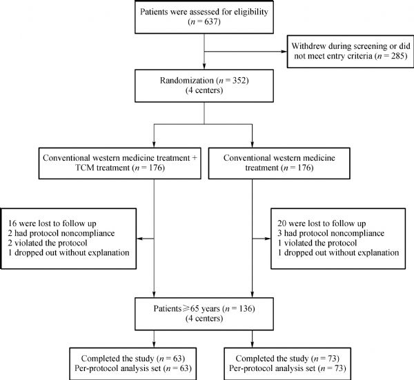 This study aimed to evaluate the efficacy of comprehensive therapy based on traditional Chinese medicine (TCM) patterns on older patients with chronic obstructive pulmonary disease (COPD) through a four-center, open-label, randomized controlled trial. Patients were divided into the trial group treated using conventional western medicine and Bu-Fei Jian-Pi granules, Bu-Fei Yi-Shen granules, and Yi-Qi Zi-Shen granules based on TCM patterns respectively; and the control group treated using conventional western medicine. A total of 136 patients≥65 years completed the study, with 63 patients comprising the trial group and 73 comprising the control group. After the six-month treatment and the 12-month follow-up period, significant differences were observed between the trial and control groups in the following aspects: frequency of acute exacerbation (P≤0.040), duration of acute exacerbation (P = 0.034), symptoms (P≤0.034), 6-min walking distance (6MWD) (P≤0.039), dyspnea scale (P≤0.036); physical domain (P≤0.019), psychological domain (P≤0.033), social domain (P≤0.020), and environmental domain (P≤0.044) of the WHOQOL-BREF questionnaire; and daily living ability domain (P≤0.007), social activity domain (P≤0.018), depression symptoms domain (P≤0.025), and anxiety symptoms domain (P≤0.037) of the COPD-QOL. No differences were observed between the trial and control groups with regard to FVC, FEV1, and FEV1%.