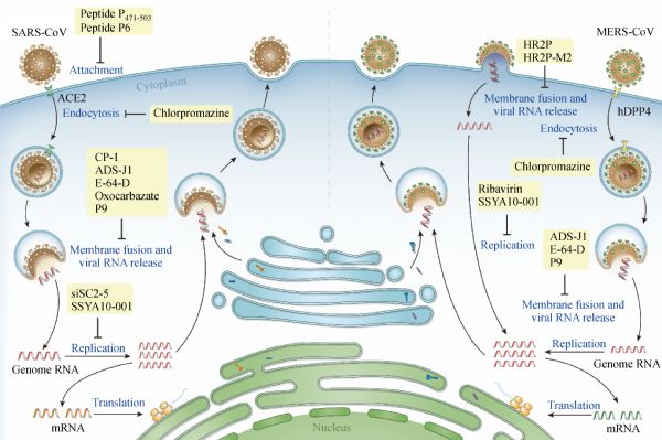 In recent years, unexpected outbreaks of infectious diseases caused by emerging and re-emerging viruses have become more frequent, which is possibly due to environmental changes. These outbreaks result in the loss of life and economic hardship. Vaccines and therapeutics should be developed for the prevention and treatment of infectious diseases. In this review, we summarize and discuss the latest progress in the development of small-molecule viral inhibitors against highly pathogenic coronaviruses, including severe acute respiratory syndrome coronavirus and Middle East respiratory syndrome coronavirus, Ebola virus, and Zika virus. These viruses can interfere with the specific steps of viral life cycle by blocking the binding between virus and host cells, disrupting viral endocytosis, disturbing membrane fusion, and interrupting viral RNA replication and translation, thereby demonstrating potent therapeutic effect against various emerging and re-emerging viruses. We also discuss some general strategies for developing small-molecule viral inhibitors.