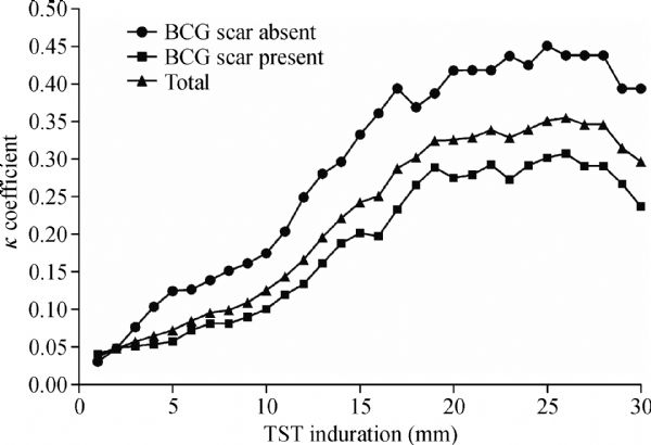 The prevalence of tuberculosis infection among adolescents born after terminating the Bacillus Calmette–Guérin (BCG) booster vaccination in China was estimated using tuberculin skin testing (TST) and QuantiFERON-TB Gold assay (QFT) to investigate the influence of neonatal BCG vaccination on the performance of TST. Data analysis was conducted for 2831 eligible participants aged 5–15 years from the baseline survey of a population-based multi-center prospective study. The prevalence rates of TST (induration≥10 mm) and QFT positivity were 9.3% (264/2827) and 2.5% (71/2831), respectively. The rate of QFT indeterminate result was 2.2% (62/2831). The overall agreement between TST and QFT was low (concordance= 88.0%; κ coefficient= 0.125). Only TST was positively associated with BCG vaccination with an adjusted odds ratio of 1.71 [95% confidence interval, 1.26–2.31]. A history of close contact with patients of active TB was significantly associated with positivity for TST and QFT. Our results suggested that BCG neonatal vaccination still affects TST performance, and a two-step approach might be considered for TB infection testing among adolescents in China.