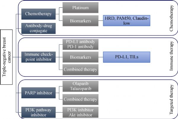 Triple-negative breast cancer (TNBC) is the most aggressive subtype of breast cancer with a heterogeneous genetic profile. Chemotherapy exhibits substantial activity in a small subset of these patients. Drug resistance is inevitable. Major progress has been made in the genetic analysis of TNBC to identify novel targets and increase the precision of therapeutic intervention. Such progress has translated into major advances in treatment strategies, including modified chemotherapy approaches, immune checkpoint inhibitors, and targeted therapeutic drugs. All of these strategies have been evaluated in clinical trials. Nevertheless, patient selection remains a considerable challenge in clinical practice.