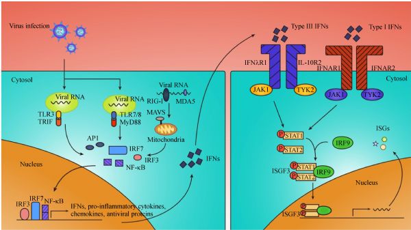 RNA viruses cause a multitude of human diseases, including several pandemic events in the past century. Upon viral invasion, the innate immune system responds rapidly and plays a key role in activating the adaptive immune system. In the innate immune system, the interactions between pathogen-associated molecular patterns and host pattern recognition receptors activate multiple signaling pathways in immune cells and induce the production of pro-inflammatory cytokines and interferons to elicit antiviral responses. Macrophages, dendritic cells, and natural killer cells are the principal innate immune components that exert antiviral activities. In this review, the current understanding of innate immunity contributing to the restriction of RNA viral infections was briefly summarized. Besides the main role of immune cells in combating viral infection, the intercellular transfer of pathogen and host-derived materials and their epigenetic and metabolic interactions associated with innate immunity was discussed. This knowledge provides an enhanced understanding of the innate immune response to RNA viral infections in general and aids in the preparation for the existing and next emerging viral infections.