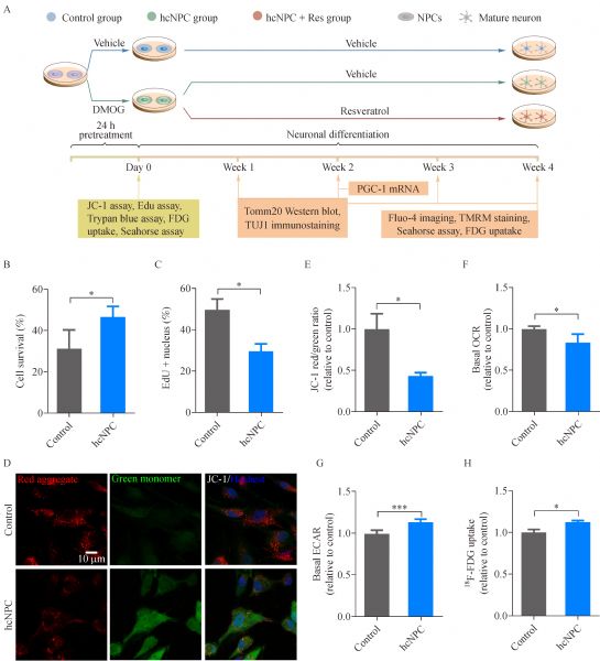 Hypoxia conditioning could increase the survival of transplanted neuronal progenitor cells (NPCs) in rats with cerebral ischemia but could also hinder neuronal differentiation partly by suppressing mitochondrial metabolism. In this work, the mitochondrial metabolism of hypoxia-conditioned NPCs (hcNPCs) was upregulated via the additional administration of resveratrol, an herbal compound, to resolve the limitation of hypoxia conditioning on neuronal differentiation. Resveratrol was first applied during the in vitro neuronal differentiation of hcNPCs and concurrently promoted the differentiation, synaptogenesis, and functional development of neurons derived from hcNPCs and restored the mitochondrial metabolism. Furthermore, this herbal compound was used as an adjuvant during hcNPC transplantation in a photothrombotic stroke rat model. Resveratrol promoted neuronal differentiation and increased the long-term survival of transplanted hcNPCs. 18-fluorine fluorodeoxyglucose positron emission tomography and rotarod test showed that resveratrol and hcNPC transplantation synergistically improved the neurological and metabolic recovery of stroke rats. In conclusion, resveratrol promoted the neuronal differentiation and therapeutic efficiency of hcNPCs in stroke rats via restoring mitochondrial metabolism. This work suggested a novel approach to promote the clinical translation of NPC transplantation therapy.