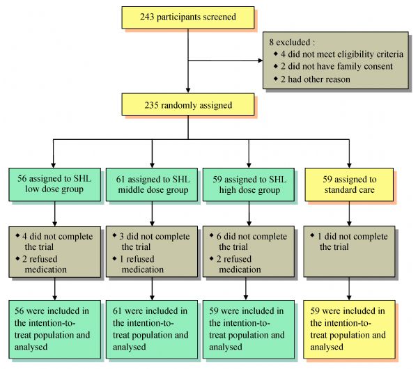 We conducted a randomized, open-label, parallel-controlled, multicenter trial on the use of Shuanghuanglian (SHL), a traditional Chinese patent medicine, in treating cases of COVID-19. A total of 176 patients received SHL by three doses (56 in low dose, 61 in middle dose, and 59 in high dose) in addition to standard care. The control group was composed of 59 patients who received standard therapy alone. Treatment with SHL was not associated with a difference from standard care in the time to disease recovery. Patients with 14-day SHL treatment had significantly higher rate in negative conversion of SARS-CoV-2 in nucleic acid swab tests than the patients from the control group (93.4% vs. 73.9%, P=0.006). Analysis of chest computed tomography images showed that treatment with high-dose SHL significantly promoted absorption of inflammatory focus of pneumonia, which was evaluated by density reduction of inflammatory focus from baseline, at day 7 (mean difference (95% CI), −46.39 (−86.83 to −5.94) HU; P=0.025) and day 14 (mean difference (95% CI), −74.21 (−133.35 to −15.08) HU; P=0.014). No serious adverse events occurred in the SHL groups. This study illustrated that SHL in combination with standard care was safe and partially effective for the treatment of COVID-19.