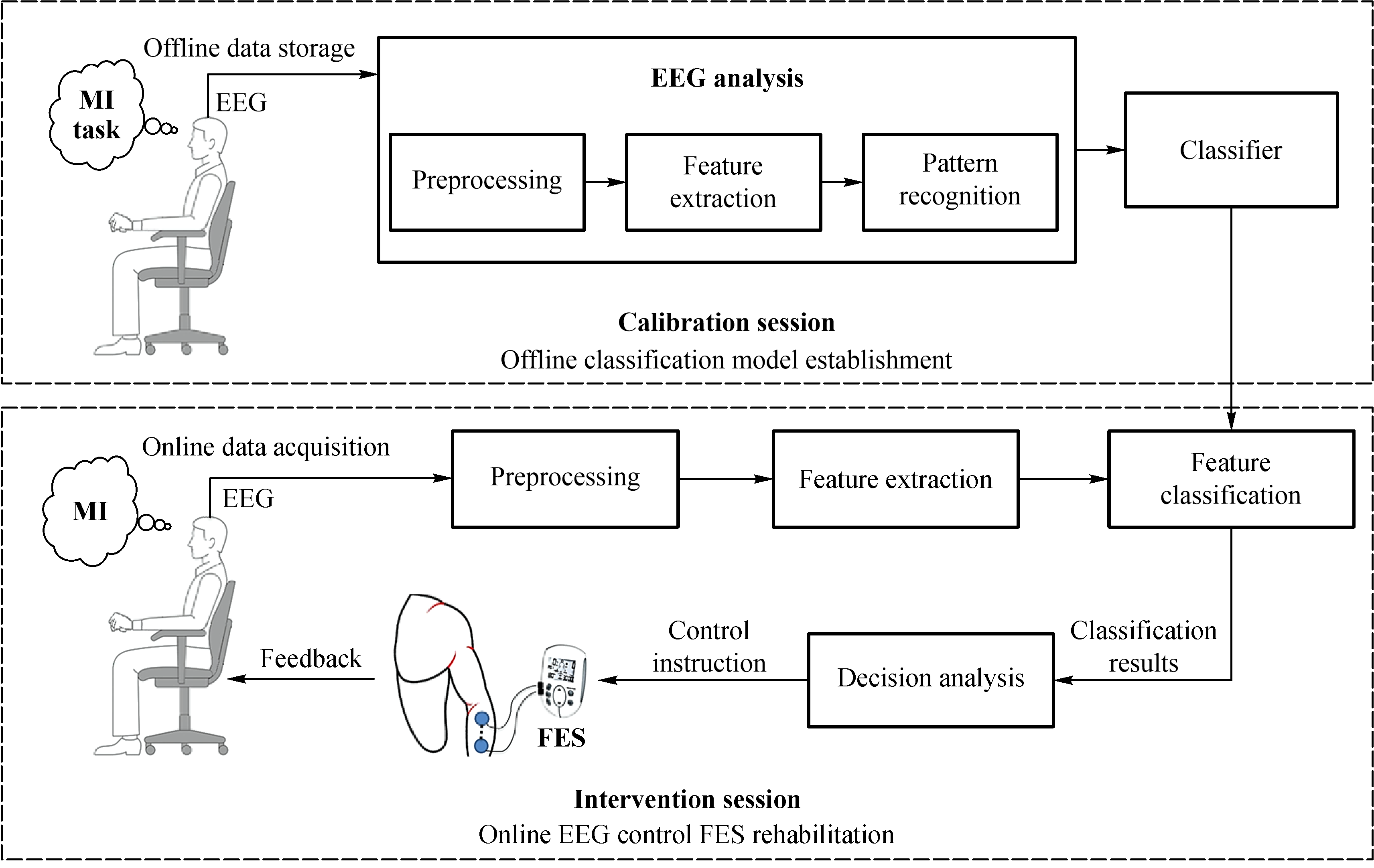 Stroke is one of the most serious diseases that threaten human life and health. It is a major cause of death and disability in the clinic. New strategies for motor rehabilitation after stroke are undergoing exploration. We aimed to develop a novel artificial neural rehabilitation system, which integrates brain--computer interface (BCI) and functional electrical stimulation (FES) technologies, for limb motor function recovery after stroke. We conducted clinical trials (including controlled trials) in 32 patients with chronic stroke. Patients were randomly divided into the BCI-FES group and the neuromuscular electrical stimulation (NMES) group. The changes in outcome measures during intervention were compared between groups, and the trends of ERD values based on EEG were analyzed for BCI-FES group. Results showed that the increase in Fugl Meyer Assessment of the Upper Extremity (FMA-UE) and Kendall Manual Muscle Testing (Kendall MMT) scores of the BCI-FES group was significantly higher than that in the sham group, which indicated the practicality and superiority of the BCI-FES system in clinical practice. The change in the laterality coefficient (LC) values based on μ-ERD (ΔLCm-ERD) had high significant positive correlation with the change in FMA-UE(r= 0.6093, P=0.012), which provides theoretical basis for exploring novel objective evaluation methods.