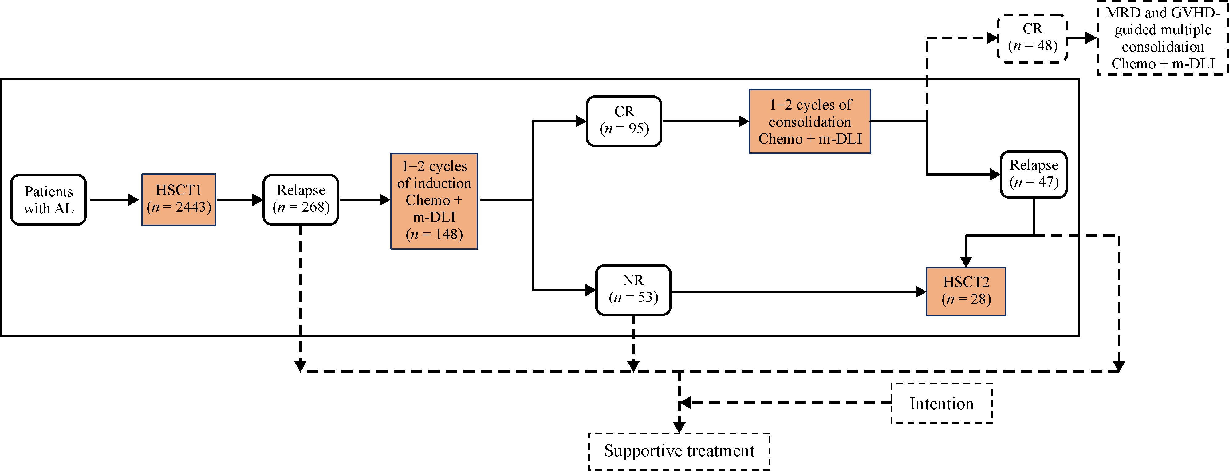 Relapse is the main problem after allogeneic hematopoietic stem cell transplantation (allo-HSCT). The outcome of a second allo-HSCT (HSCT2) for relapse post-HSCT has shown promising results in some previous studies. However, little is known about the efficacy of HSCT2 in patients with relapsed/refractory acute leukemia (AL) post-chemotherapy plus modified donor lymphocyte infusion (post-Chemo+m-DLI) after the first allo-HSCT (HSCT1). Therefore, we retrospectively analyzed the efficacy of HSCT2 in 28 patients with relapsed/refractory AL post-Chemo+m-DLI in our center. With a median follow-up of 918 (457–1732) days, 26 patients (92.9%) achieved complete remission, and 2 patients exhibited persistent disease. The probabilities of overall survival (OS) and disease-free survival (DFS) 1 year after HSCT2 were 25.0% and 21.4%, respectively. The cumulative incidences of nonrelapse mortality on day 100 and at 1 year post-HSCT2 were 7.1%±4.9% and 25.0%±8.4%. The cumulative incidences of relapse were 50.0%±9.8% and 53.5%±9.9% at 1 and 2 years post-HSCT2, respectively. Risk stratification prior to HSCT1 and percentage of blasts before HSCT2 were independent risk factors for OS post-HSCT2, and relapse within 6 months post-HSCT1 was an independent risk factor for DFS and relapse post-HSCT2. Our findings suggest that HSCT2 could be a salvage option for patients with relapsed AL post-Chemo+m-DLI.