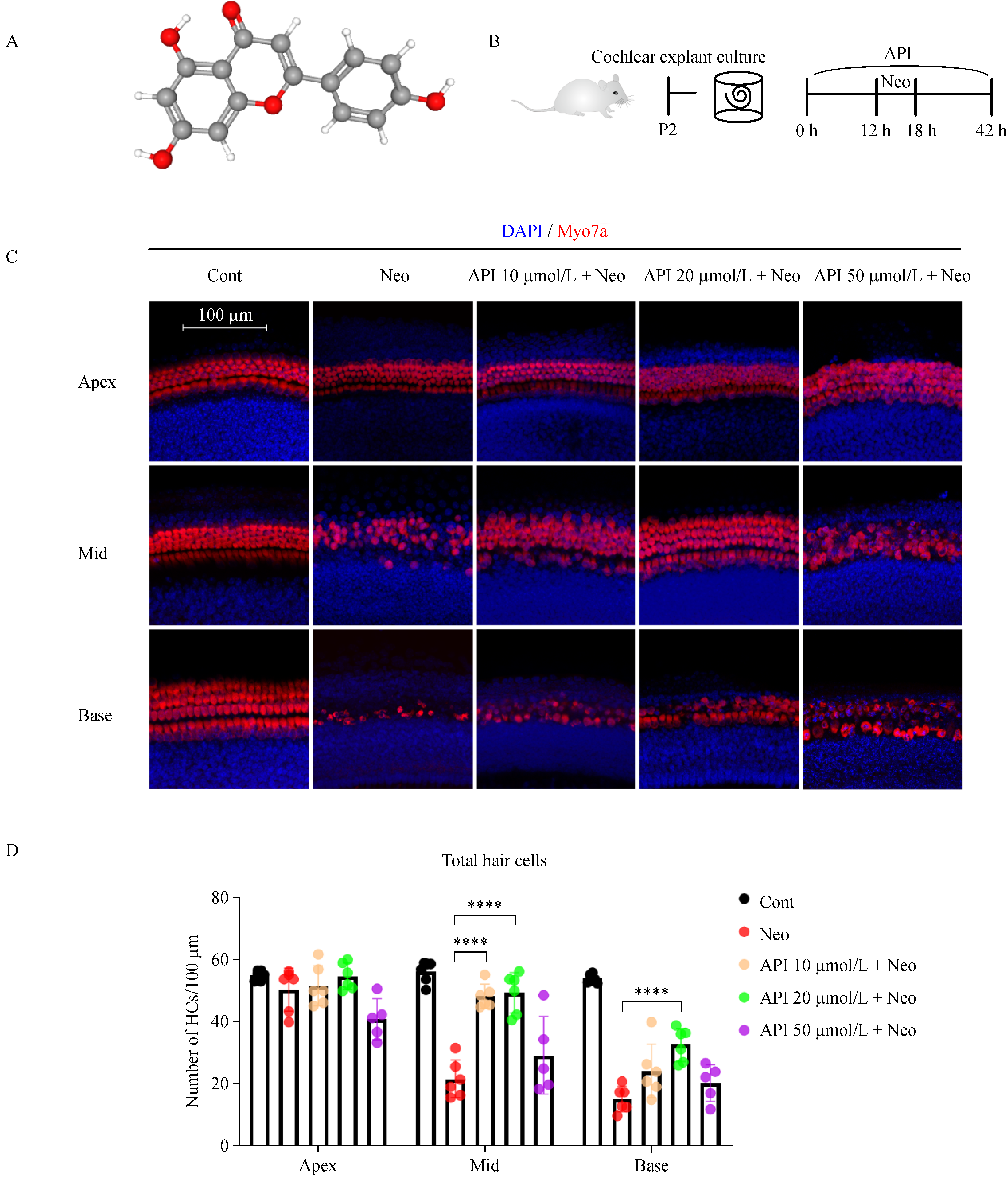 Oxidative stress plays an important role in the pathogenesis of aminoglycoside-induced hearing loss and represents a promising target for treatment. We tested the potential effect of apigenin, a natural flavonoid with anticancer, anti-inflammatory, and antioxidant activities, on neomycin-induced ototoxicity in cochlear hair cells in vitro. Results showed that apigenin significantly ameliorated the loss of hair cells and the accumulation of reactive oxygen species upon neomycin injury. Further evidence suggested that the nuclear factor erythroid 2-related factor 2 (Nrf2) signaling pathway was activated by apigenin treatment. Disruption of the Nrf2 axis abolished the effects of apigenin on the alleviation of oxidative stress and subsequent apoptosis of hair cells. This study provided evidence of the protective effect of apigenin on cochlear hair cells and its underlying mechanism.