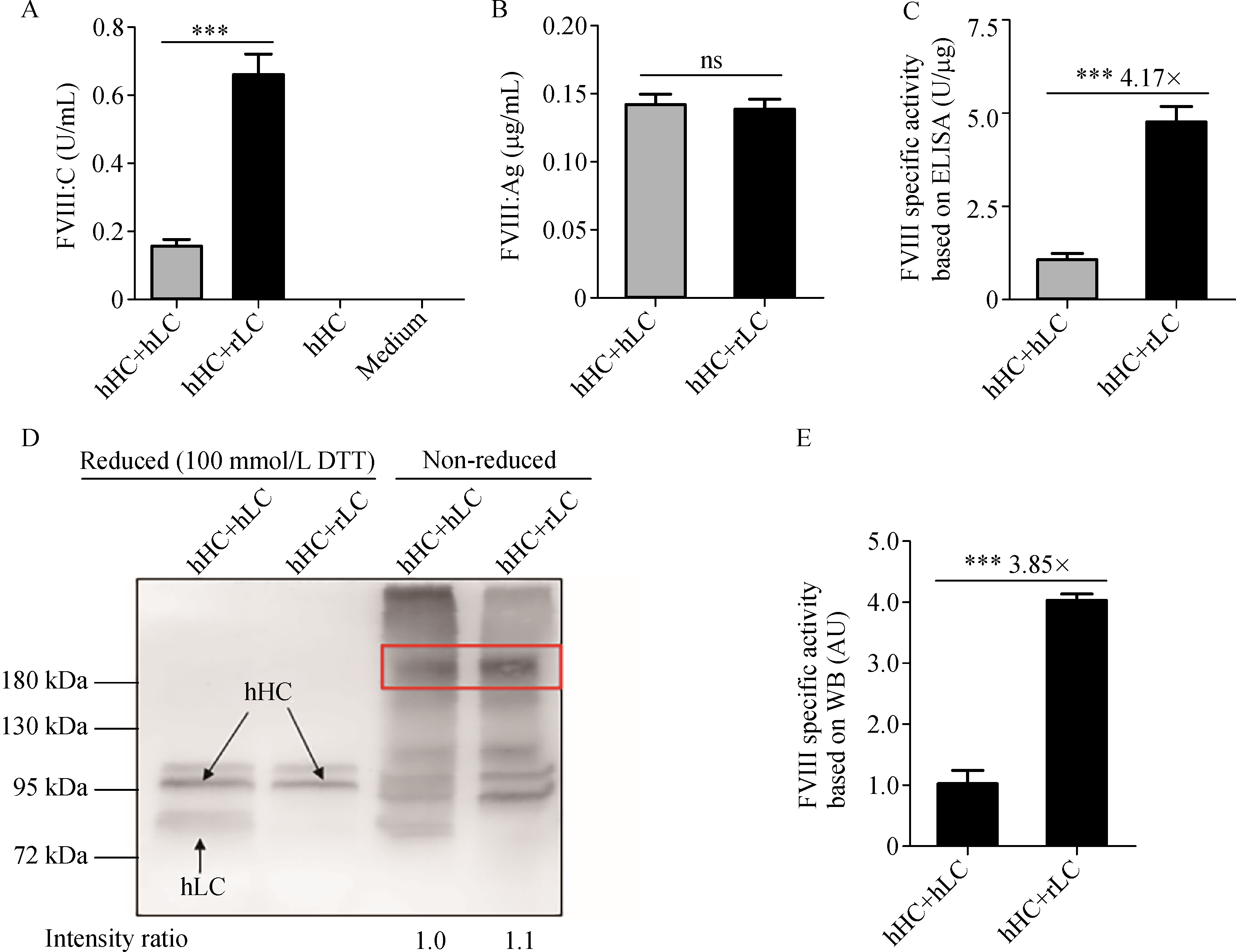 Conventional therapies for hemophilia A (HA) are prophylactic or on-demand intravenous FVIII infusions. However, they are expensive and inconvenient to perform. Thus, better strategies for HA treatment must be developed. In this study, a recombinant FVIII cDNA encoding a human/rat hybrid FVIII with an enhanced procoagulant potential for adeno-associated virus (AAV)-delivered gene therapy was developed. Plasmids containing human FVIII heavy chain (hHC), human light chain (hLC), and rat light chain (rLC) were transfected into cells and hydrodynamically injected into HA mice. Purified AAV viruses were intravenously injected into HA mice at two doses. Results showed that the hHC+ rLC protein had a higher activity than the hHC+ hLC protein at comparable expression levels. The specific activity of hHC+ rLC was about 4- to 8-fold higher than that of their counterparts. Hydrodynamic injection experiments obtained consistent results. Notably, the HA mice undergoing the AAV-delivered hHC+ rLC treatment exhibited a visibly higher activity than those treated with hHC+ hLC, and the therapeutic effects lasted for up to 40 weeks. In conclusion, the application of the hybrid FVIII (hHC+ rLC) via an AAV-delivered gene therapy substantially improved the hemorrhagic diathesis of the HA mice. These data might be of help to the development of optimized FVIII expression cassette for HA gene therapy.