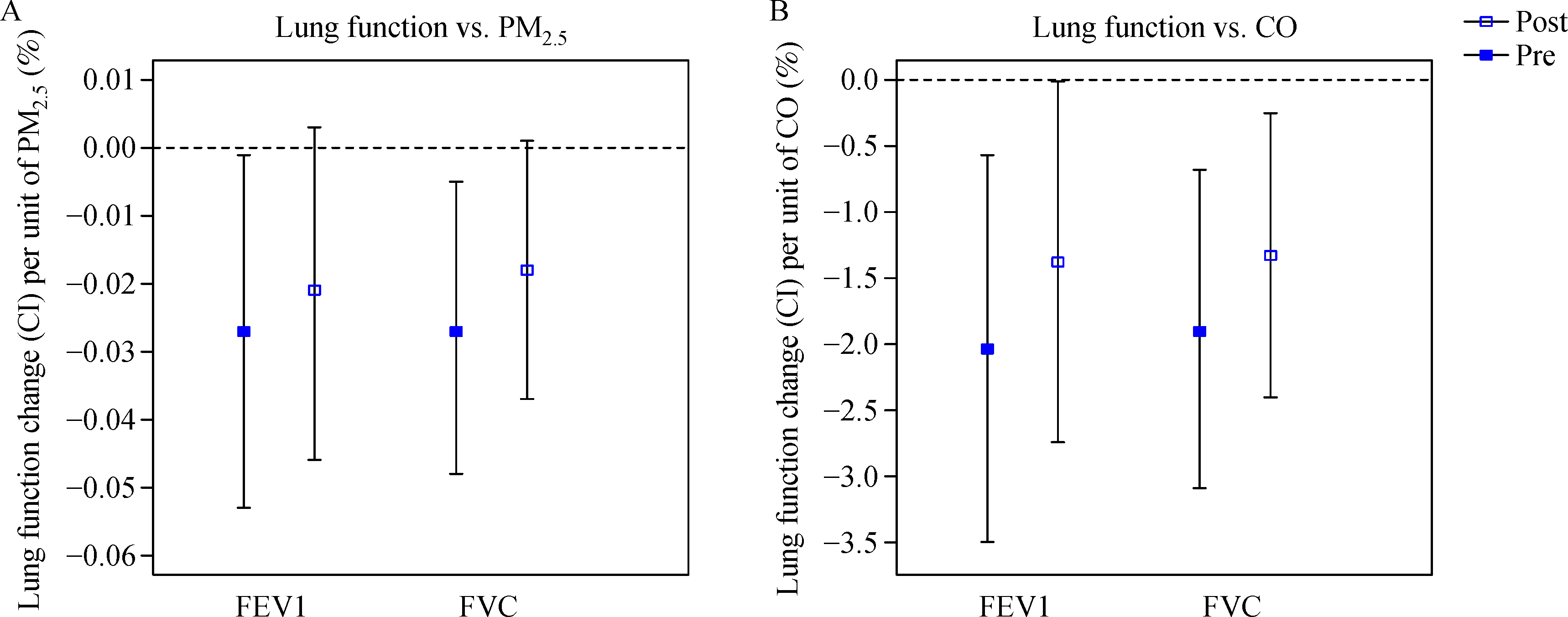 The effect of air pollution on the lung function of adults with asthma remains unclear to date. This study followed 112 patients with asthma at 3-month intervals for 2 years. The pollutant exposure of the participants was estimated using the inverse distance weight method. The participants were divided into three groups according to their lung function level at every visit. A linear mixed-effect model was applied to predict the change in lung function with each unit change in pollution concentration. Exposure to carbon monoxide (CO) and particles less than 2.5 micrometers in diameter (PM2.5) was negatively associated with large airway function in participants. In the severe group, exposure to chronic sulfur dioxide (SO2) was negatively associated with post-bronchodilator forced expiratory flow at 50%, between 25% and 75% of vital capacity % predicted (change of 95% CI per unit: –0.34 (–0.55, –0.12), –0.24 (–0.44, –0.03), respectively). In the mild group, the effect of SO2 on the small airways was similar to that in the severe group, and it was negatively associated with large airway function. Exposure to CO and PM2.5 was negatively associated with the large airway function of adults with asthma. The negative effects of SO2 were more evident and widely observed in adults with severe and mild asthma than in adults with moderate asthma. Patients with asthma react differently to air pollutants as evidenced by their lung function levels.