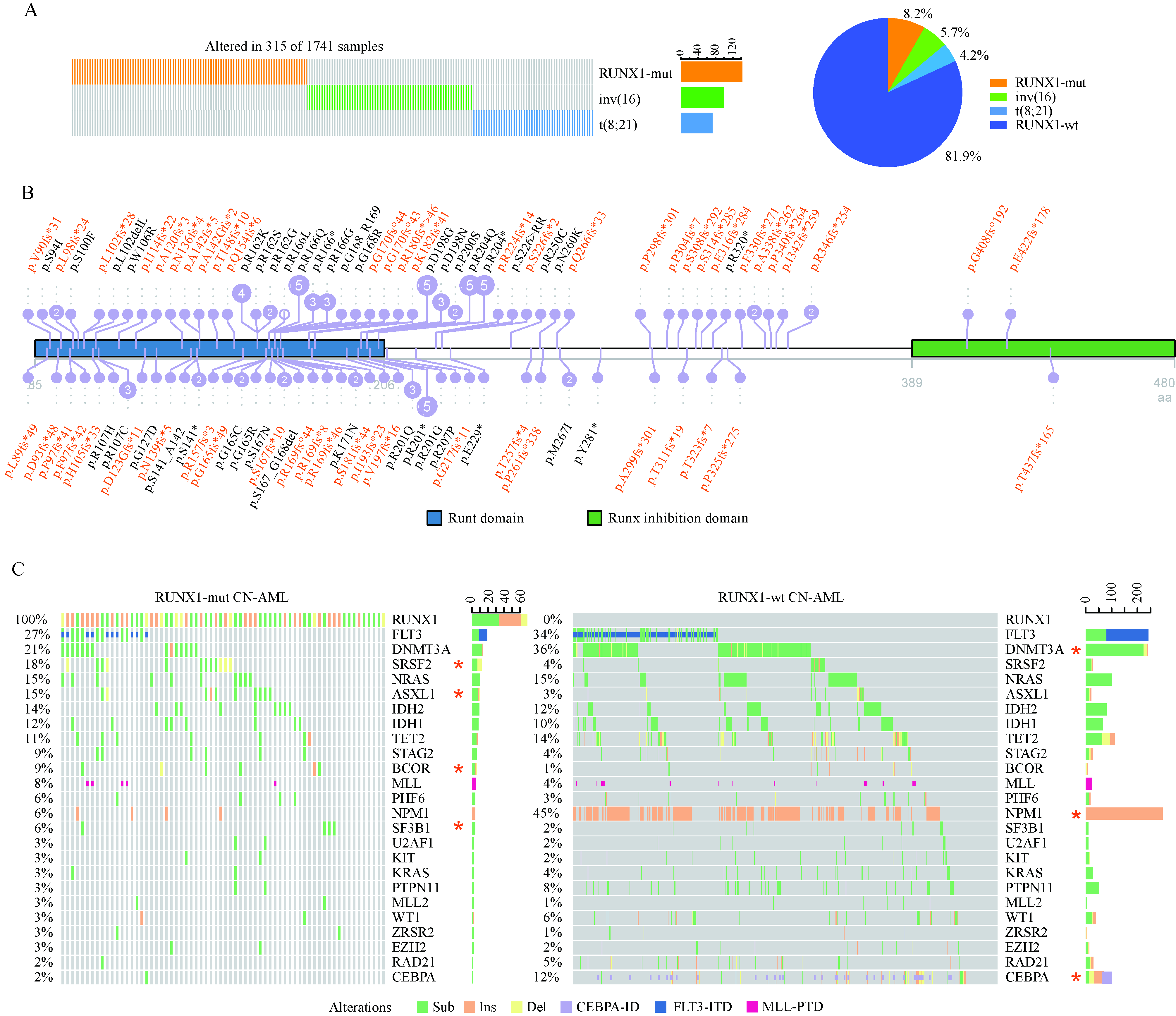 Runt-related transcription factor 1 (RUNX1) is an essential regulator of normal hematopoiesis. Its dysfunction, caused by either fusions or mutations, is frequently reported in acute myeloid leukemia (AML). However, RUNX1 mutations have been largely under-explored compared with RUNX1 fusions mainly due to their elusive genetic characteristics. Here, based on 1741 patients with AML, we report a unique expression pattern associated with RUNX1 mutations in AML. This expression pattern was coordinated by target repression and promoter hypermethylation. We first reanalyzed a joint AML cohort that consisted of three public cohorts and found that RUNX1 mutations were mainly distributed in the Runt domain and almost mutually exclusive with NPM1 mutations. Then, based on RNA-seq data from The Cancer Genome Atlas AML cohort, we developed a 300-gene signature that significantly distinguished the patients with RUNX1 mutations from those with other AML subtypes. Furthermore, we explored the mechanisms underlying this signature from the transcriptional and epigenetic levels. Using chromatin immunoprecipitation sequencing data, we found that RUNX1 target genes tended to be repressed in patients with RUNX1 mutations. Through the integration of DNA methylation array data, we illustrated that hypermethylation on the promoter regions of RUNX1-regulated genes also contributed to dysregulation in RUNX1-mutated AML. This study revealed the distinct gene expression pattern of RUNX1 mutations and the underlying mechanisms in AML development.