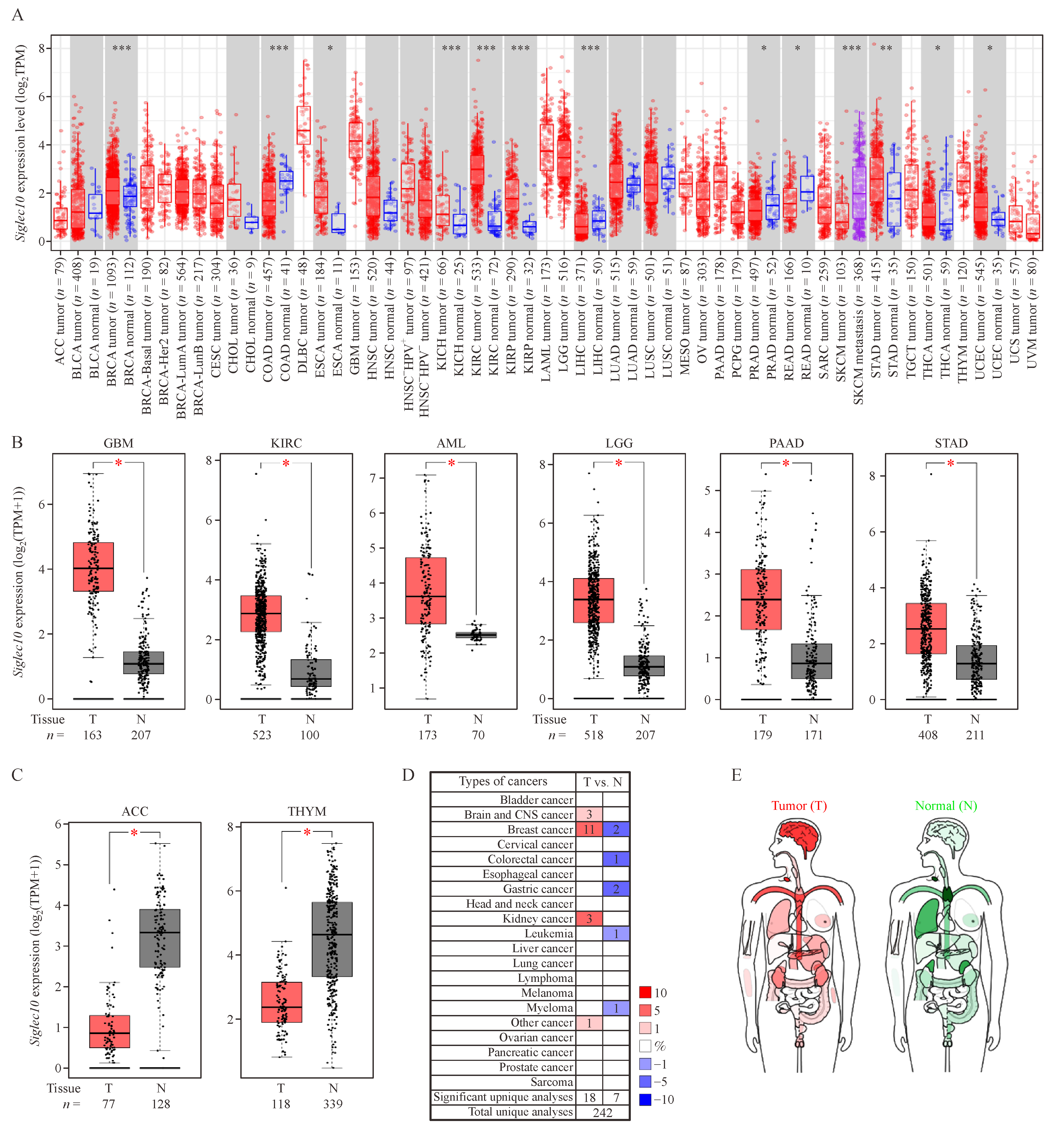 Sialic acid binding Ig-like lectin 10 (Siglec10) is a member of innate immune checkpoints that inhibits the activation of immune cells through the interaction with its ligand CD24 on tumor cells. Here, by analyzing public databases containing 64 517 patients of 33 cancer types, we found that the expression of Siglec10 was altered in 18 types of cancers and was associated with the clinical outcomes of 11 cancer types. In particular, Siglec10 was upregulated in patients with kidney renal clear cell carcinoma (KIRC) and was inversely associated with the prognosis of the patients. In 131 KIRC patients of our settings, Siglec10 was elevated in the tumor tissues of 83 (63.4%) patients compared with that in their counterpart normal kidney tissues. Moreover, higher level of Siglec10 was associated with advanced disease (stages III and IV) and worse prognosis. Silencing of CD24 in KIRC cells significantly increased the number of Siglec10-expressing macrophages phagocytosing KIRC cells. In addition, luciferase activity assays suggested that Siglec10 was a potential target of the transcription factors c-FOS and GATA1, which were identified by data mining. These results demonstrate that Siglec10 may have important oncogenic functions in KIRC, and represents a novel target for the development of immunotherapies.