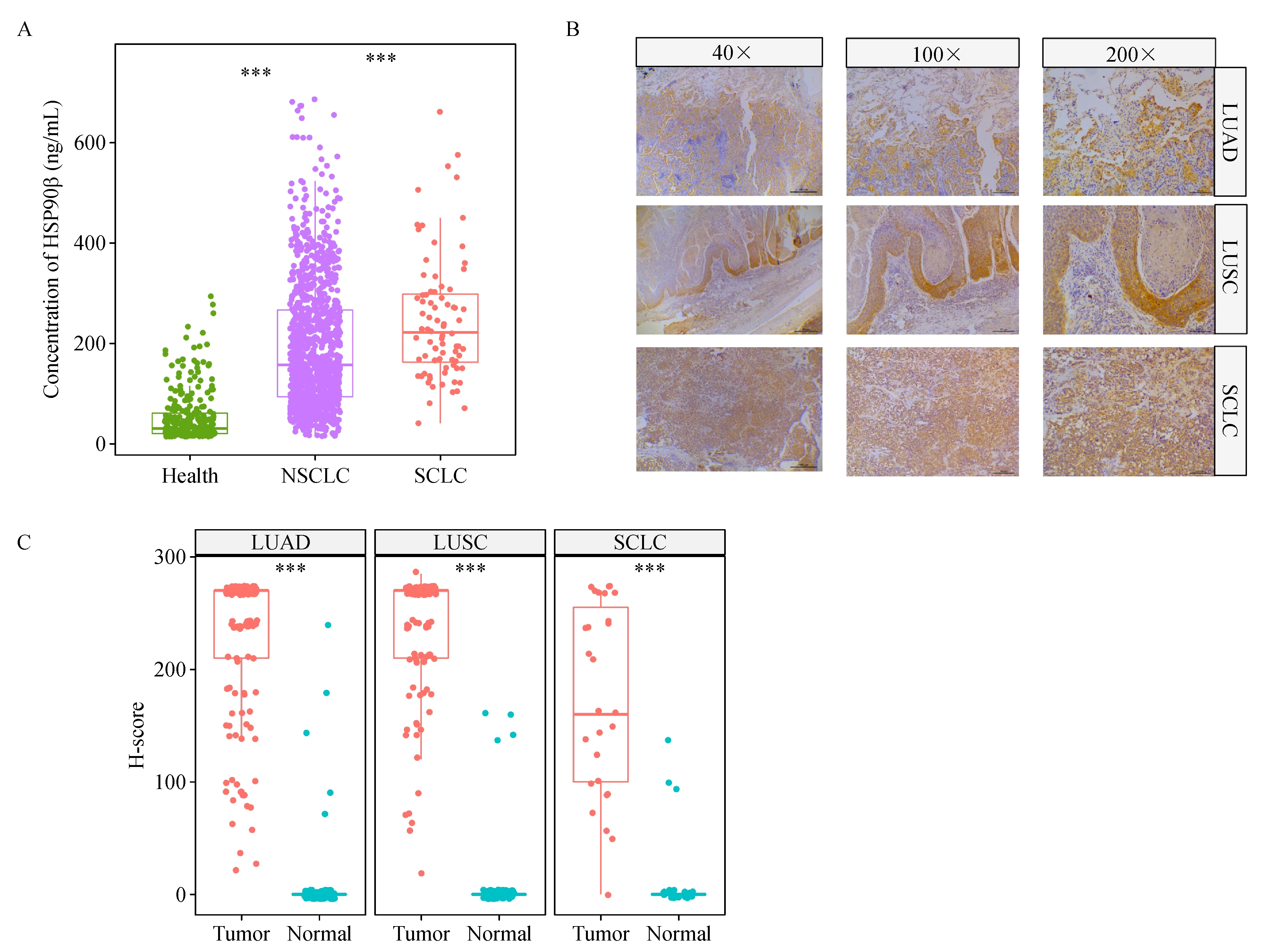 Patients with lung cancer at the same stage may have markedly different overall outcome and a lack of specific biomarker to predict lung cancer outcome. Heat-shock protein 90 β (HSP90β) is overexpressed in various tumor cells. In this study, the ELISA results of HSP90β combined with CEA, CA125, and CYFRA21-1 were used to construct a recursive partitioning decision tree model to establish a four-protein diagnostic model and predict the survival of patients with lung cancer. Survival analysis showed that the recursive partitioning decision tree could distinguish the prognosis between high- and low-risk groups. Results suggested that the joint detection of HSP90β, CEA, CA125, and CYFRA21-1 in the peripheral blood of patients with lung cancer is plausible for early diagnosis and prognosis prediction of lung cancer.