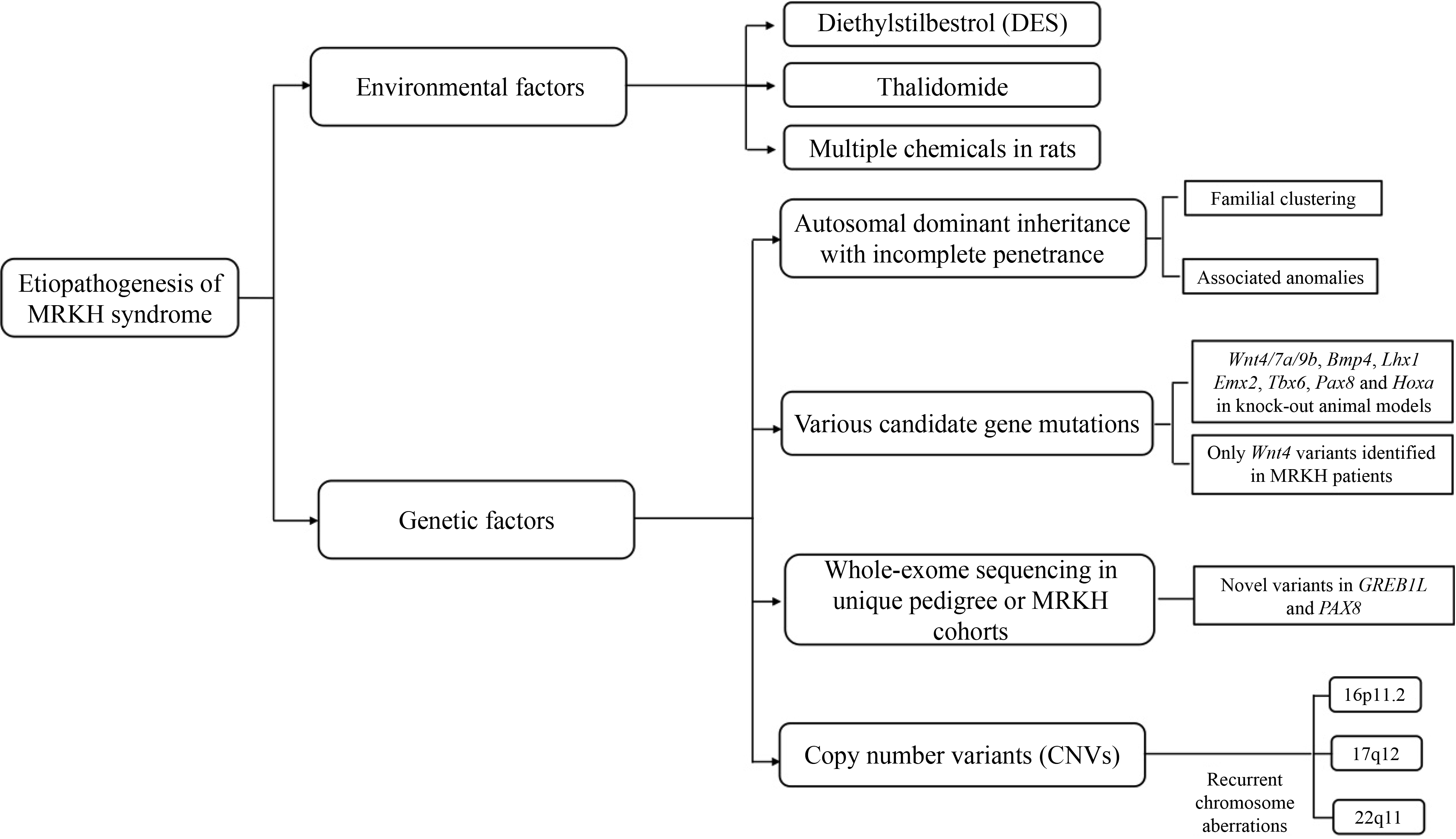 This review presents an update of Mayer–Rokitansky–Küster–Hauser (MRKH) syndrome on its etiologic, clinical, diagnostic, psychological, therapeutic, and reproductive aspects. The etiology of MRKH syndrome remains unclear due to its intrinsic heterogeneity. Nongenetic and genetic causes that may interact during the embryonic development have been proposed with no definitive etiopathogenesis identified. The proportion of concomitant extragenital malformations varies in different studies, and the discrepancies may be explained by ethnic differences. In addition to physical examination and pelvic ultrasound, the performance of pelvic magnetic resonance imaging is crucial in detecting the presence of rudimentary uterine endometrium. MRKH syndrome has long-lasting psychological effects on patients, resulting in low esteem, poor coping strategies, depression, and anxiety symptoms. Providing psychological counseling and peer support to diagnosed patients is recommended. Proper and timely psychological intervention could significantly improve a patient’s outcome. Various nonsurgical and surgical methods have been suggested for treatment of MRKH syndrome. Due to the high success rate and minimal risk of complications, vaginal dilation has been proven to be the first-line therapy. Vaginoplasty is the second-line option for patients experiencing dilation failure. Uterine transplantation and gestational surrogacy are options for women with MRKH syndrome to achieve biological motherhood.