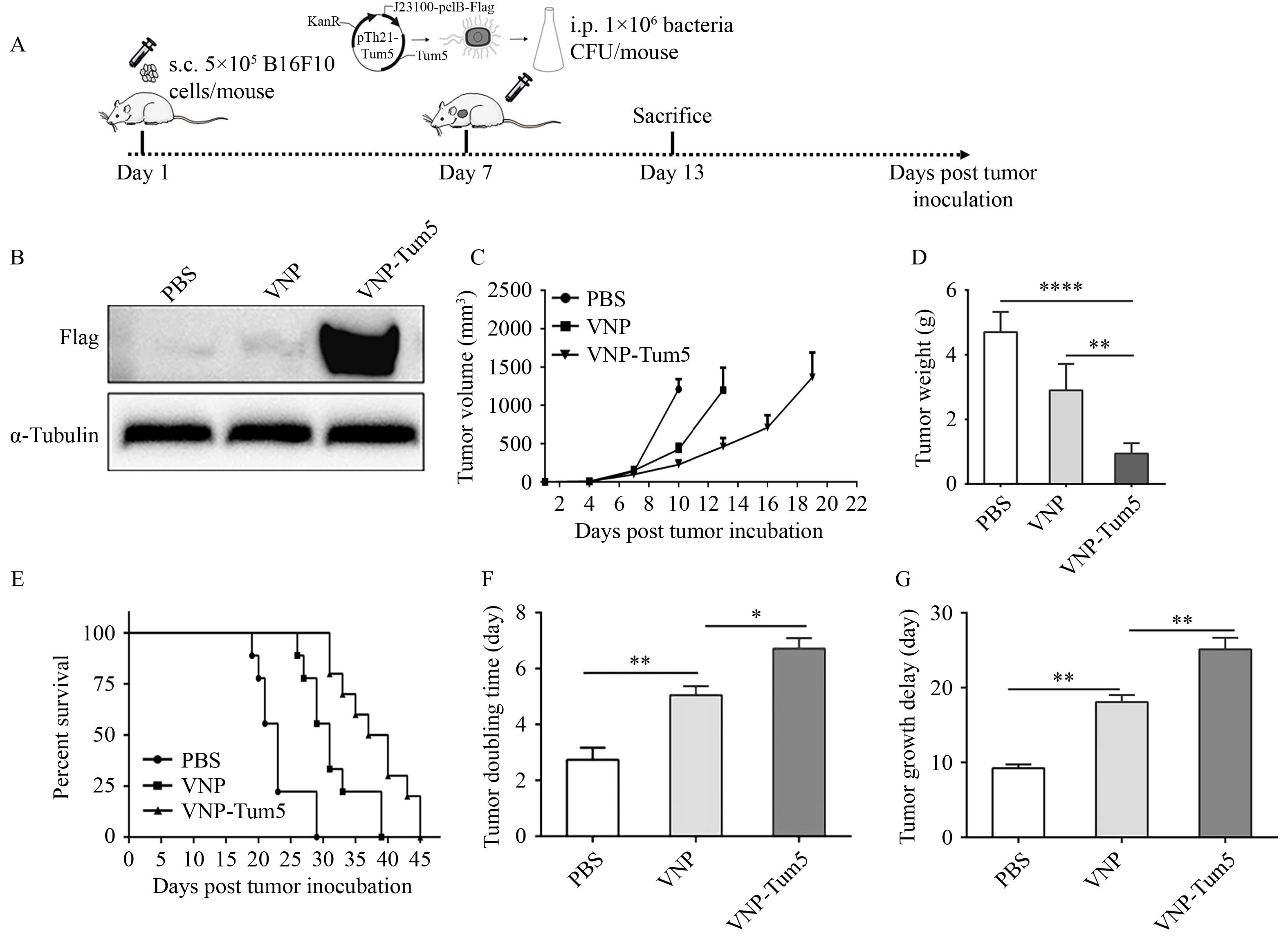 Tumor growth is an angiogenesis-dependent process and accompanied by the formation of hypoxic areas. Tumstatin is a tumor-specific angiogenesis inhibitor that suppresses the proliferation and induces the apoptosis of tumorous vascular endothelial cells. VNP20009, an attenuated Salmonella typhimurium strain, preferentially accumulates in the hypoxic areas of solid tumors. In this study, a novel Salmonella-mediated targeted expression system of tumstatin (VNP-Tum5) was developed under the control of the hypoxia-induced J23100 promoter to obtain anti-tumor efficacy in mice. Treatment with VNP-Tum5 effectively suppressed tumor growth and prolonged survival in the mouse model of B16F10 melanoma. VNP-Tum5 exhibited a higher efficacy in inhibiting the proliferation and inducing the necrosis and apoptosis of B16F10 cells in vitro and in vivo compared with VNP (control). VNP-Tum5 significantly inhibited the proliferation and migration of mouse umbilical vascular endothelial cells to impede angiogenesis. VNP-Tum5 downregulated the expression of anti-vascular endothelial growth factor A, platelet endothelial cell adhesion molecule-1, phosphorylated phosphoinositide 3 kinase, and phosphorylated protein kinase B and upregulated the expression of cleaved-caspase 3 in tumor tissues. This study is the first to use tumstatin-transformed VNP20009 as a tumor-targeted system for treatment of melanoma by combining anti-tumor and anti-angiogenic effects.