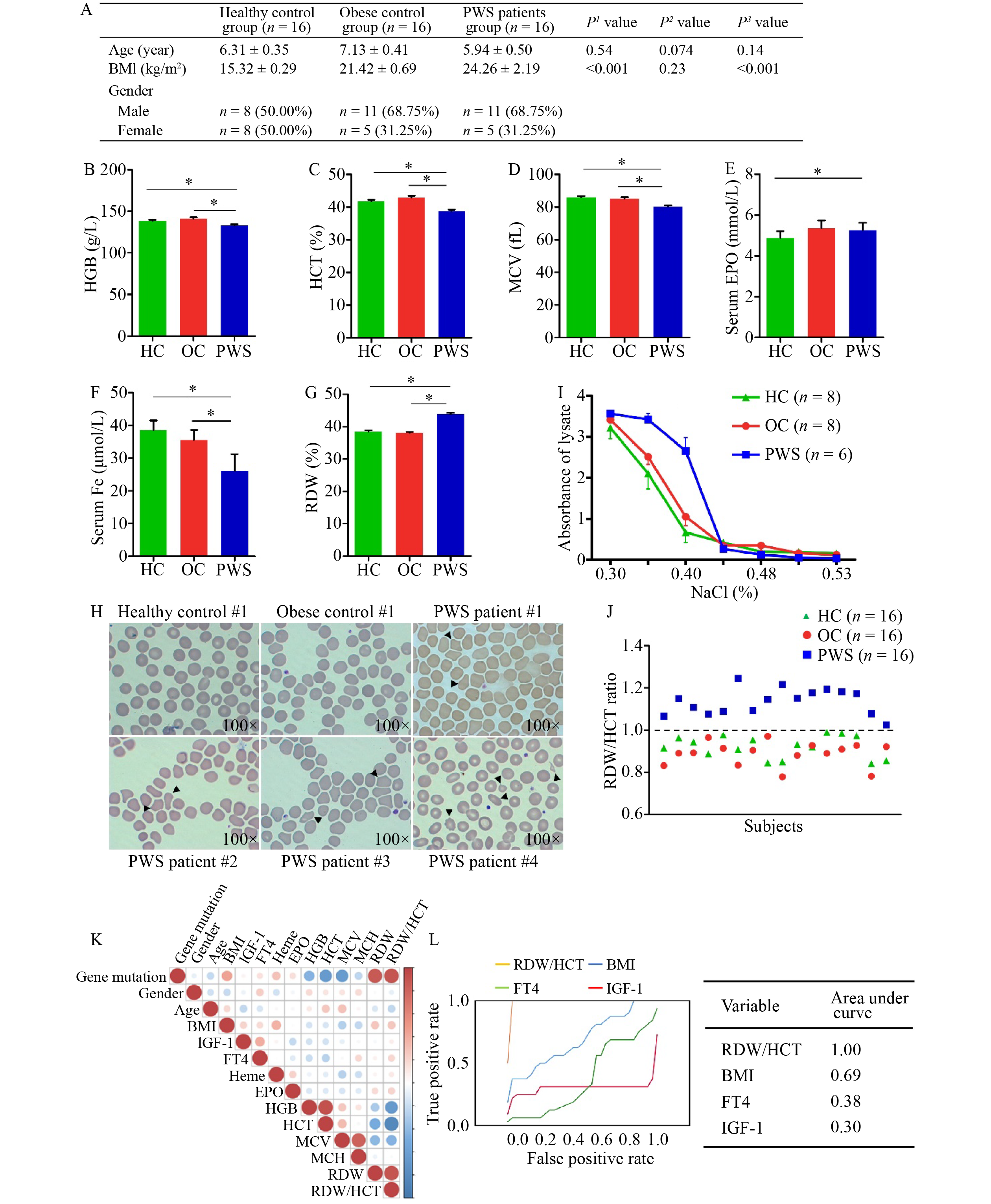 Prader–Willi syndrome (PWS) is a rare congenital disease with genetic alterations in chromosome 15. Although genetic disorders and DNA methylation abnormalities involved in PWS have been investigated to a significant degree, other anomalies such as those in erythrocytes may occur and these have not been clearly elucidated. In the present study, we uncovered slight anemia in children with PWS that was associated with increased red blood cell (RBC) distribution width (RDW) and contrarily reduced hematocrit (HCT) values. Intriguingly, the increased ratio in RDW to HCT allowed sufficient differentiation between the PWS patients from the healthy controls and, importantly, with individuals exhibiting conventional obesity. Further morphologic examinations revealed a significant deformity in erythrocytes and mild hemolysis in PWS patients. Comprehensive mechanistic investigations unveiled compromised membrane skeletal assembly and membrane lipid composition, and revealed a reduced F-actin/G-actin ratio in PWS patients. We ascribed these phenotypic changes in erythrocytes to the observed genetic defects, including DNA methylation abnormalities. Our collective data allowed us to uncover RBC deformation in children with PWS, and this may constitute an auxiliary indicator of PWS in early childhood.