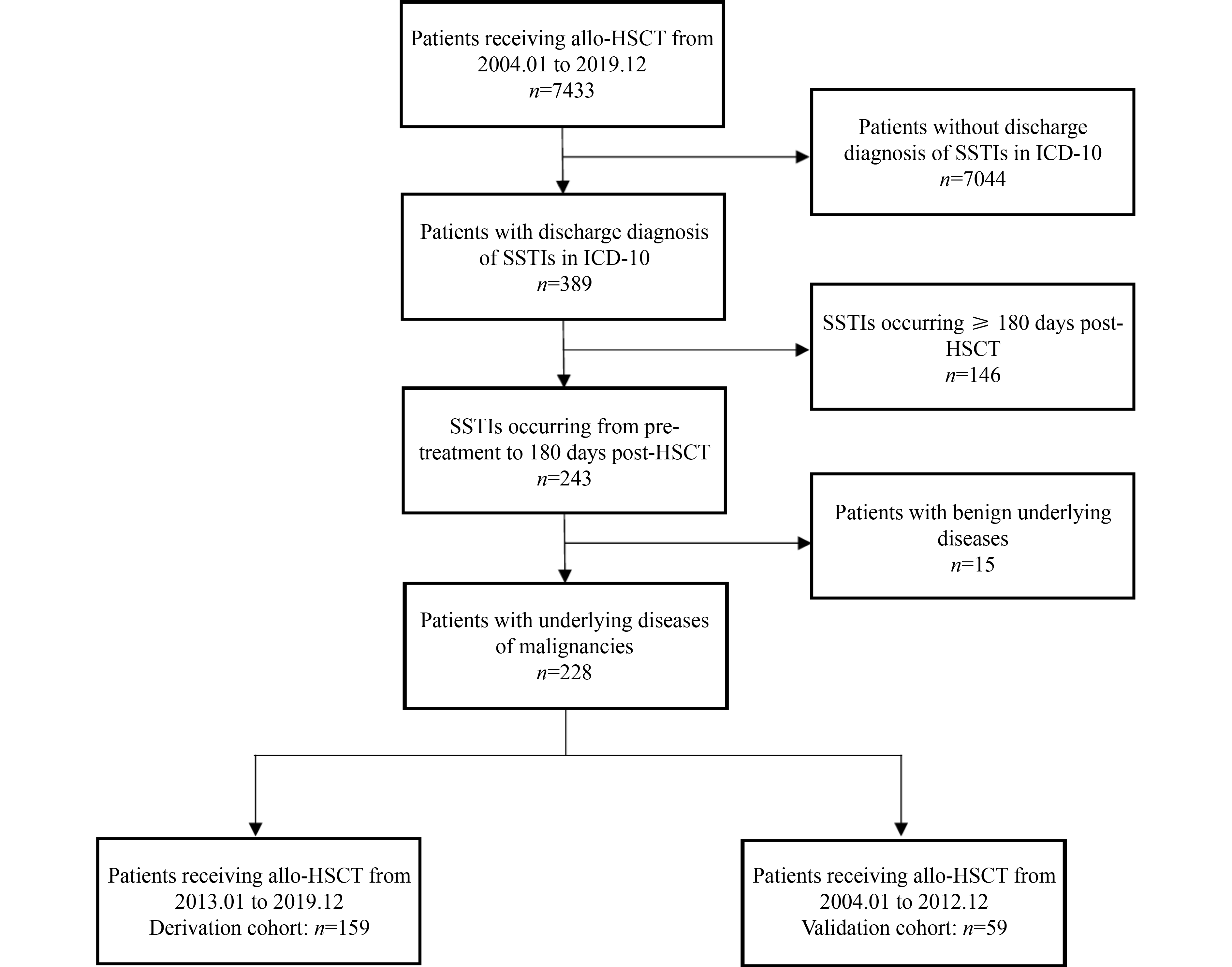 Skin and soft tissue infections (SSTIs) refer to infections involving the skin, subcutaneous tissue, fascia, and muscle. In transplant populations with hematological malignancies, an immunocompromised status and the routine use of immunosuppressants increase the risk of SSTIs greatly. However, to date, the profiles and clinical outcomes of SSTIs in hematopoietic stem cell transplantation (HSCT) patients remain unclear. This study included 228 patients (3.67%) who developed SSTIs within 180 days after allogeneic HSCT from January 2004 to December 2019 in Peking University People’s Hospital. The overall annual survival rate was 71.5%. We compared the differences between survivors and non-survivors a year after transplant and found that primary platelet graft failure (PPGF), comorbidities of acute kidney injury (AKI), and hospital-acquired pneumonia (HAP) were independent risk factors for death in the study population. A PPGF–AKI–HAP risk stratification system was established with a mortality risk score of 1×PPGF+1×AKI+1×HAP. The areas under the curves of internal and external validation were 0.833 (95% CI 0.760–0.906) and 0.826 (95% CI 0.715–0.937), respectively. The calibration plot revealed the high consistency of the estimated risks, and decision curve analysis showed considerable net benefits for patients.