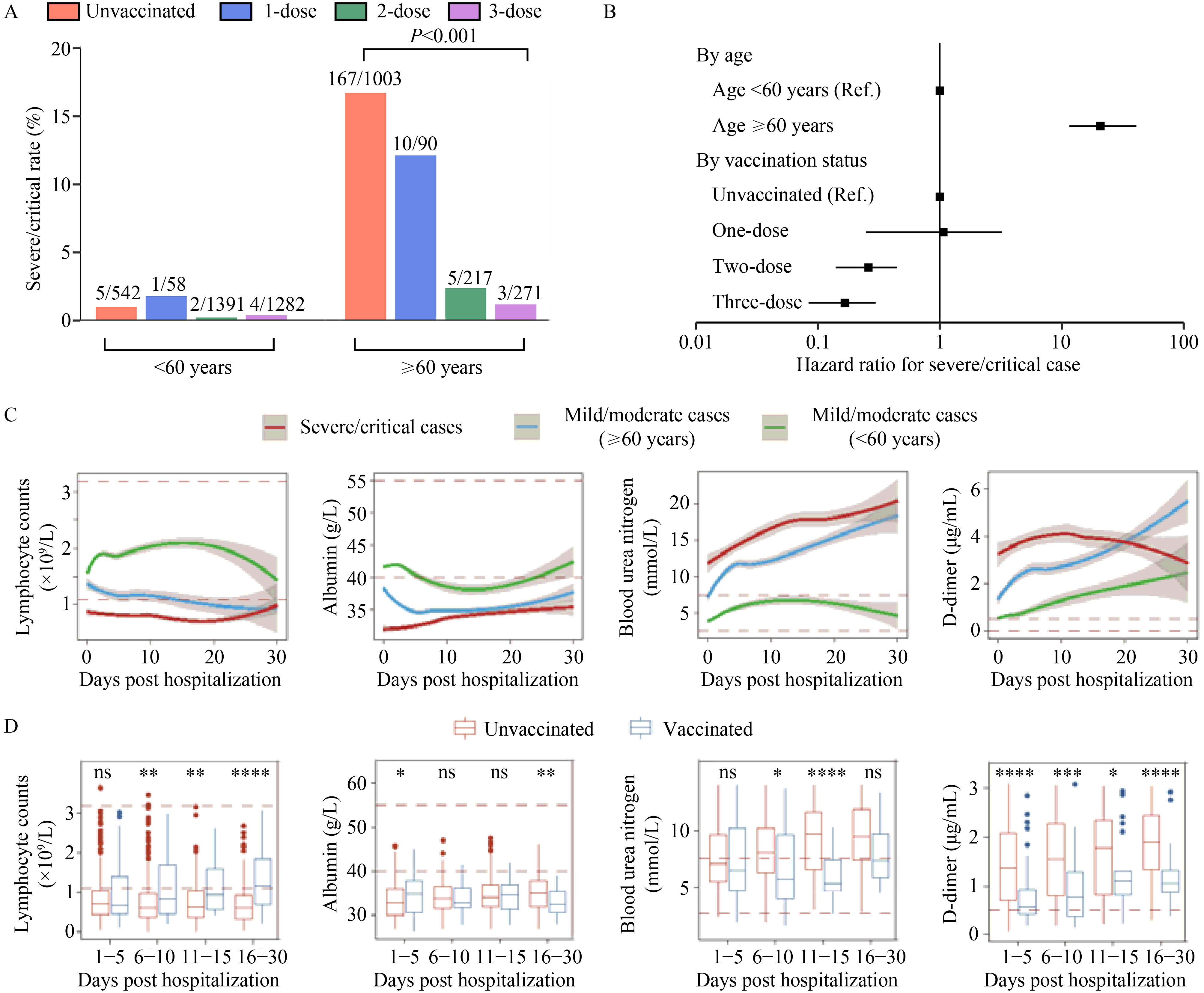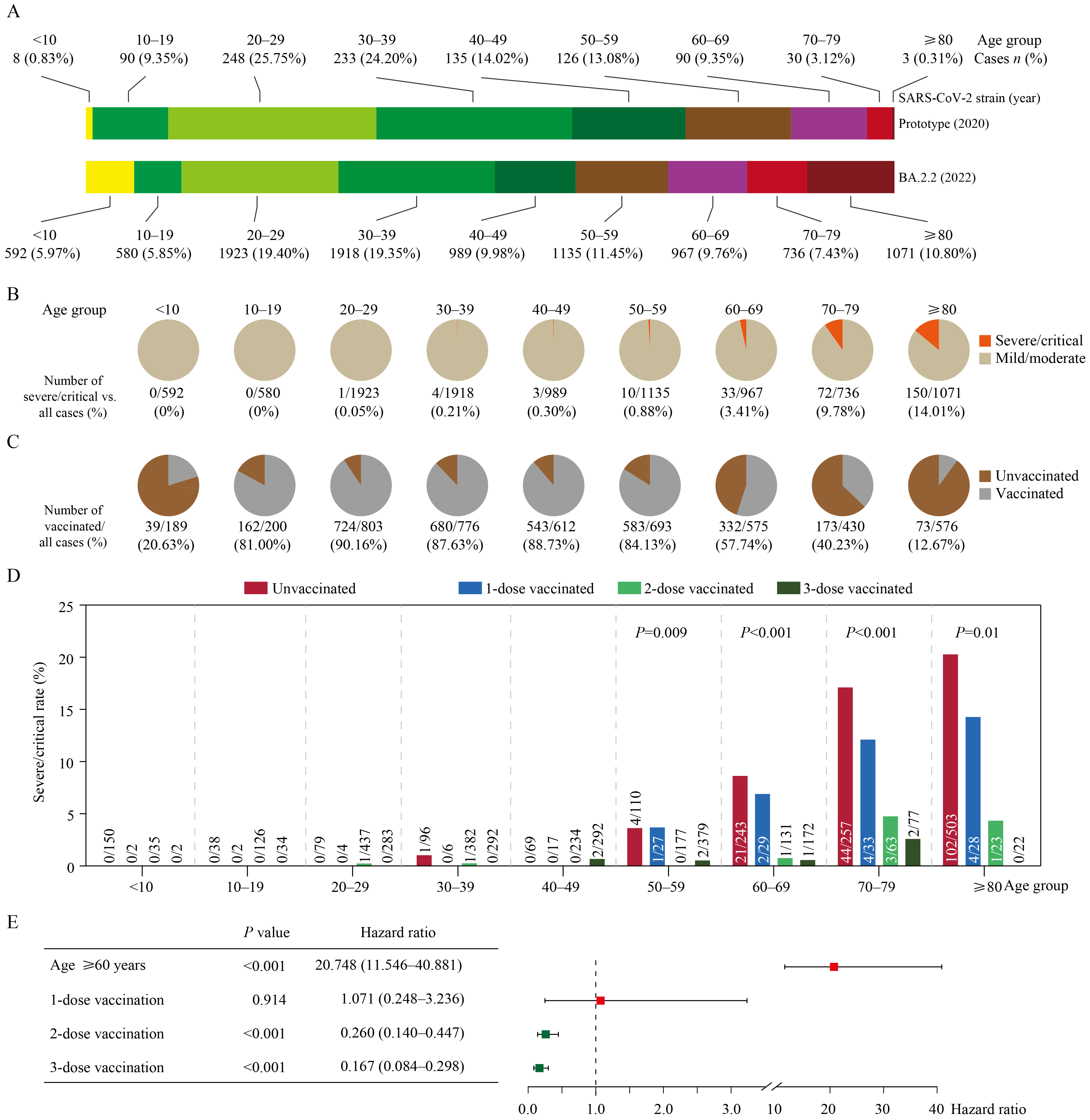 The Omicron family of SARS-CoV-2 variants are currently driving the COVID-19 pandemic. Here we analyzed the clinical laboratory test results of 9911 Omicron BA.2.2 sublineages-infected symptomatic patients without earlier infection histories during a SARS-CoV-2 outbreak in Shanghai in spring 2022. Compared to an earlier patient cohort infected by SARS-CoV-2 prototype strains in 2020, BA.2.2 infection led to distinct fluctuations of pathophysiological markers in the peripheral blood. In particular, severe/critical cases of COVID-19 post BA.2.2 infection were associated with less pro-inflammatory macrophage activation and stronger interferon alpha response in the bronchoalveolar microenvironment. Importantly, the abnormal biomarkers were significantly subdued in individuals who had been immunized by 2 or 3 doses of SARS-CoV-2 prototype-inactivated vaccines, supporting the estimation of an overall 96.02% of protection rate against severe/critical disease in the 4854 cases in our BA.2.2 patient cohort with traceable vaccination records. Furthermore, even though age was a critical risk factor of the severity of COVID-19 post BA.2.2 infection, vaccination-elicited protection against severe/critical COVID-19 reached 90.15% in patients aged ≥ 60 years old. Together, our study delineates the pathophysiological features of Omicron BA.2.2 sublineages and demonstrates significant protection conferred by prior prototype-based inactivated vaccines.