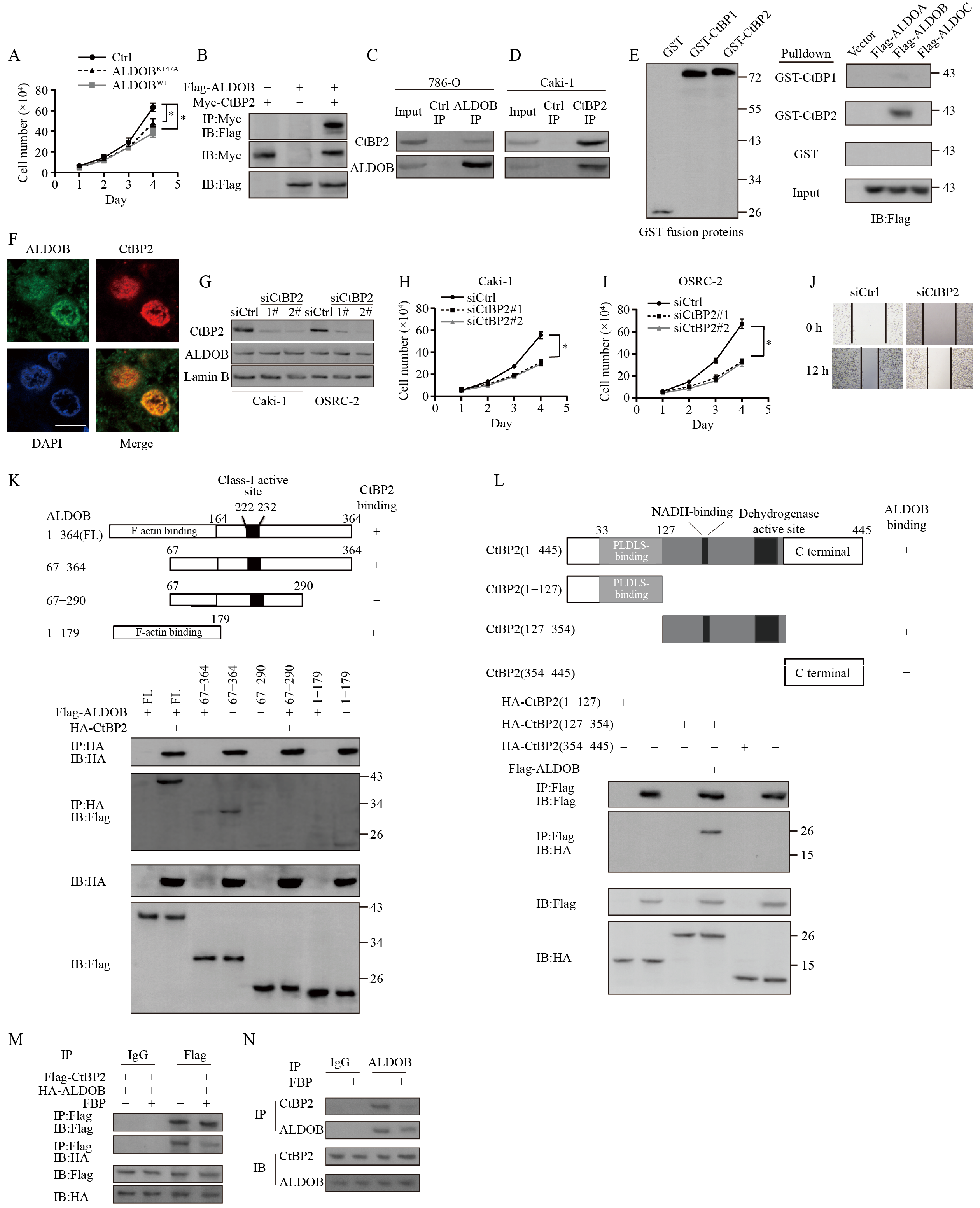 Aldolase B (ALDOB), a glycolytic enzyme, is uniformly depleted in clear cell renal cell carcinoma (ccRCC) tissues. We previously showed that ALDOB inhibited proliferation through a mechanism independent of its enzymatic activity in ccRCC, but the mechanism was not unequivocally identified. We showed that the corepressor C-terminal-binding protein 2 (CtBP2) is a novel ALDOB-interacting protein in ccRCC. The CtBP2-to-ALDOB expression ratio in clinical samples was correlated with the expression of CtBP2 target genes and was associated with shorter survival. ALDOB inhibited CtBP2-mediated repression of multiple cell cycle inhibitor, proapoptotic, and epithelial marker genes. Furthermore, ALDOB overexpression decreased the proliferation and migration of ccRCC cells in an ALDOB-CtBP2 interaction-dependent manner. Mechanistically, our findings showed that ALDOB recruited acireductone dioxygenase 1, which catalyzes the synthesis of an endogenous inhibitor of CtBP2, 4-methylthio 2-oxobutyric acid. ALDOB functions as a scaffold to bring acireductone dioxygenase and CtBP2 in close proximity to potentiate acireductone dioxygenase-mediated inhibition of CtBP2, and this scaffolding effect was independent of ALDOB enzymatic activity. Moreover, increased ALDOB expression inhibited tumor growth in a xenograft model and decreased lung metastasis in vivo. Our findings reveal that ALDOB is a negative regulator of CtBP2 and inhibits tumor growth and metastasis in ccRCC.