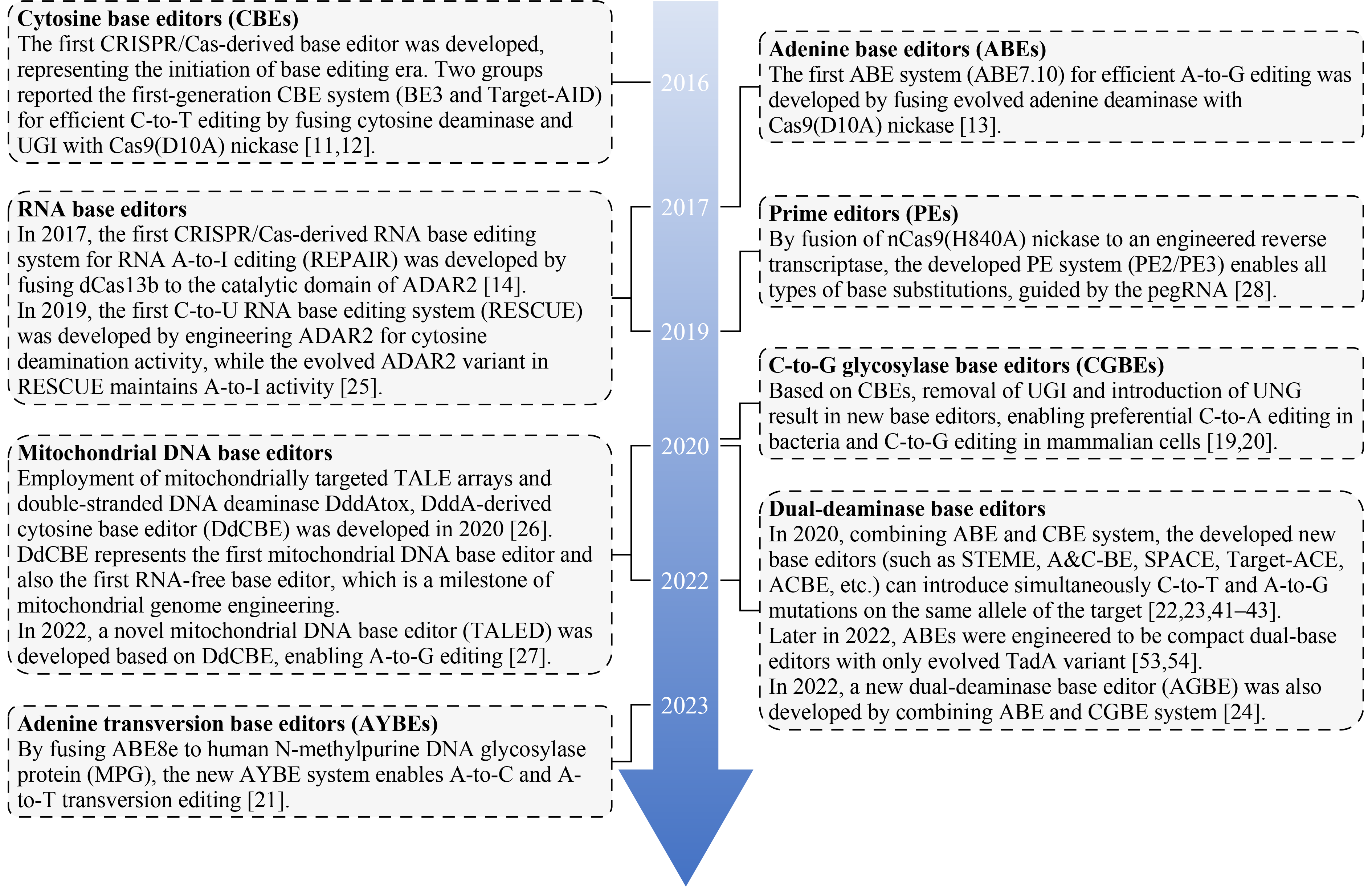 Base editor (BE) is a gene-editing tool developed by combining the CRISPR/Cas system with an individual deaminase, enabling precise single-base substitution in DNA or RNA without generating a DNA double-strand break (DSB) or requiring donor DNA templates in living cells. Base editors offer more precise and secure genome-editing effects than other conventional artificial nuclease systems, such as CRISPR/Cas9, as the DSB induced by Cas9 will cause severe damage to the genome. Thus, base editors have important applications in the field of biomedicine, including gene function investigation, directed protein evolution, genetic lineage tracing, disease modeling, and gene therapy. Since the development of the two main base editors, cytosine base editors (CBEs) and adenine base editors (ABEs), scientists have developed more than 100 optimized base editors with improved editing efficiency, precision, specificity, targeting scope, and capacity to be delivered in vivo, greatly enhancing their application potential in biomedicine. Here, we review the recent development of base editors, summarize their applications in the biomedical field, and discuss future perspectives and challenges for therapeutic applications.