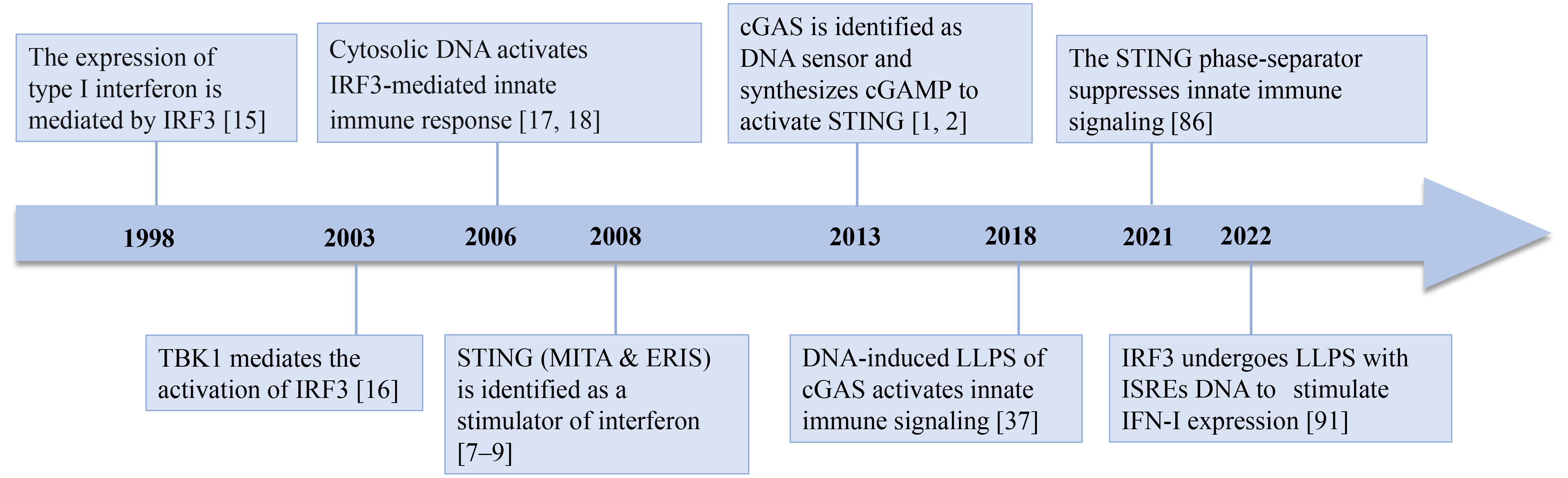 Biomolecular condensates formed by phase separation are widespread and play critical roles in many physiological and pathological processes. cGAS-STING signaling functions to detect aberrant DNA signals to initiate anti-infection defense and antitumor immunity. At the same time, cGAS-STING signaling must be carefully regulated to maintain immune homeostasis. Interestingly, exciting recent studies have reported that biomolecular phase separation exists and plays important roles in different steps of cGAS-STING signaling, including cGAS condensates, STING condensates, and IRF3 condensates. In addition, several intracellular and extracellular factors have been proposed to modulate the condensates in cGAS-STING signaling. These studies reveal novel activation and regulation mechanisms of cGAS-STING signaling and provide new opportunities for drug discovery. Here, we summarize recent advances in the phase separation of cGAS-STING signaling and the development of potential drugs targeting these innate immune condensates.