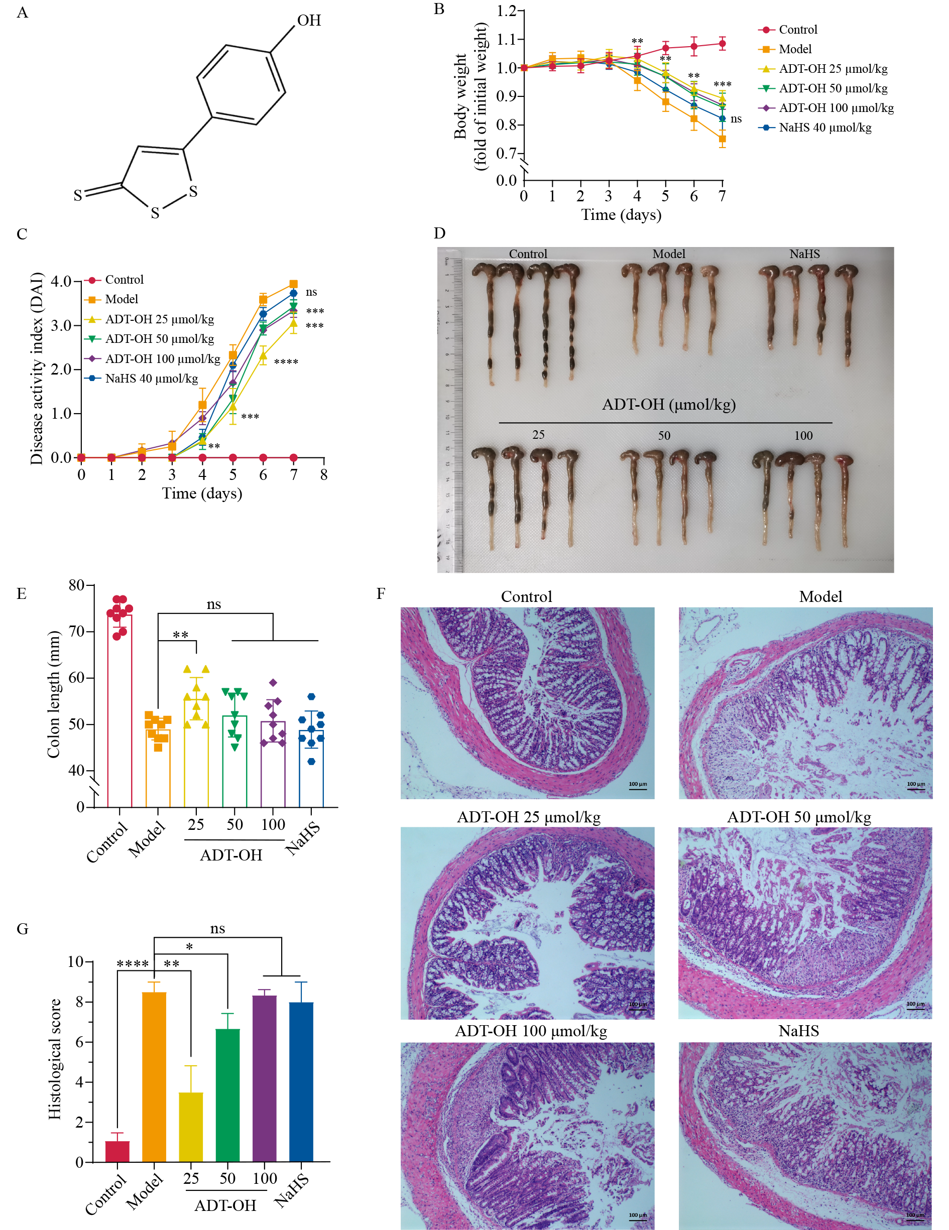 Owing to the increasing incidence and prevalence of inflammatory bowel disease (IBD) worldwide, effective and safe treatments for IBD are urgently needed. Hydrogen sulfide (H2S) is an endogenous gasotransmitter and plays an important role in inflammation. To date, H2S-releasing agents are viewed as potential anti-inflammatory drugs. The slow-releasing H2S donor 5-(4-hydroxyphenyl)-3H-1,2-dithiole-3-thione (ADT-OH), known as a potent therapeutic with chemopreventive and cytoprotective properties, has received attention recently. Here, we reported its anti-inflammatory effects on dextran sodium sulfate (DSS)-induced acute (7 days) and chronic (30 days) colitis. We found that ADT-OH effectively reduced the DSS-colitis clinical score and reversed the inflammation-induced shortening of colon length. Moreover, ADT-OH reduced intestinal inflammation by suppressing the nuclear factor kappa-B pathway. In vivo and in vitro results showed that ADT-OH decreased intestinal permeability by increasing the expression of zonula occludens-1 and occludin and blocking increases in myosin II regulatory light chain phosphorylation and epithelial myosin light chain kinase protein expression levels. In addition, ADT-OH restored intestinal microbiota dysbiosis characterized by the significantly increased abundance of Muribaculaceae and Alistipes and markedly decreased abundance of Helicobacter, Mucispirillum, Parasutterella, and Desulfovibrio. Transplanting ADT-OH-modulated microbiota can alleviate DSS-induced colitis and negatively regulate the expression of local and systemic proinflammatory cytokines. Collectively, ADT-OH is safe without any short-term (5 days) or long-term (30 days) toxicological adverse effects and can be used as an alternative therapeutic agent for IBD treatment.