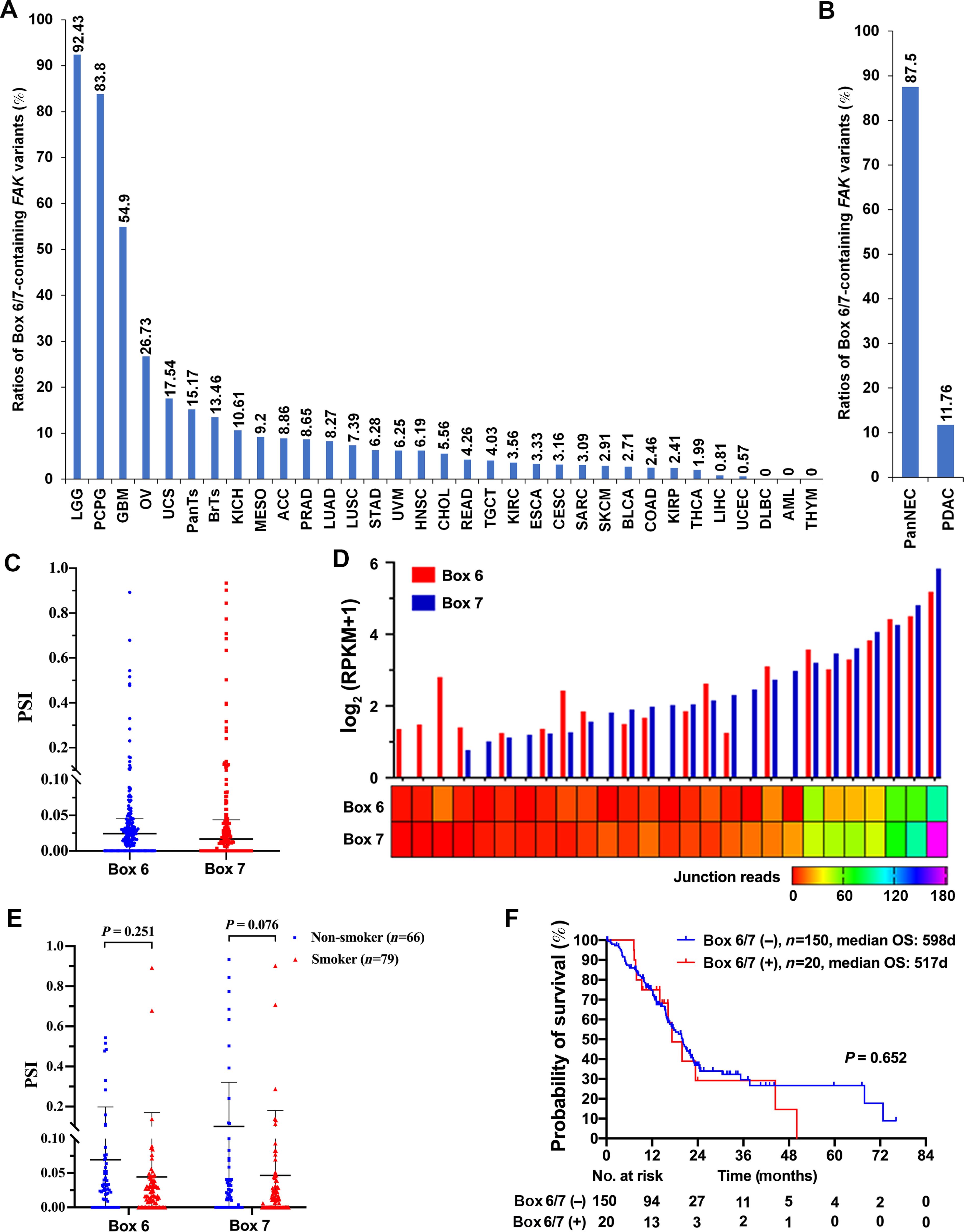 The characteristic genetic abnormality of neuroendocrine neoplasms (NENs), a heterogeneous group of tumors found in various organs, remains to be identified. Here, based on the analysis of the splicing variants of an oncogene Focal Adhesion Kinase (FAK) in The Cancer Genome Atlas datasets that contain 9193 patients of 33 cancer subtypes, we found that Box 6/Box 7-containing FAK variants (FAK6/7) were observed in 7 (87.5%) of 8 pancreatic neuroendocrine carcinomas and 20 (11.76%) of 170 pancreatic ductal adenocarcinomas (PDACs). We tested FAK variants in 157 tumor samples collected from Chinese patients with pancreatic tumors, and found that FAK6/7 was positive in 34 (75.6%) of 45 pancreatic NENs, 19 (47.5%) of 40 pancreatic solid pseudopapillary neoplasms, and 2 (2.9%) of 69 PDACs. We further tested FAK splicing variants in breast neuroendocrine carcinoma (BrNECs), and found that FAK6/7 was positive in 14 (93.3%) of 15 BrNECs but 0 in 23 non-NEC breast cancers. We explored the underlying mechanisms and found that a splicing factor serine/arginine repetitive matrix protein 4 (SRRM4) was overexpressed in FAK6/7-positive pancreatic tumors and breast tumors, which promoted the formation of FAK6/7 in cells. These results suggested that FAK6/7 could be a biomarker of NENs and represent a potential therapeutic target for these orphan diseases.
