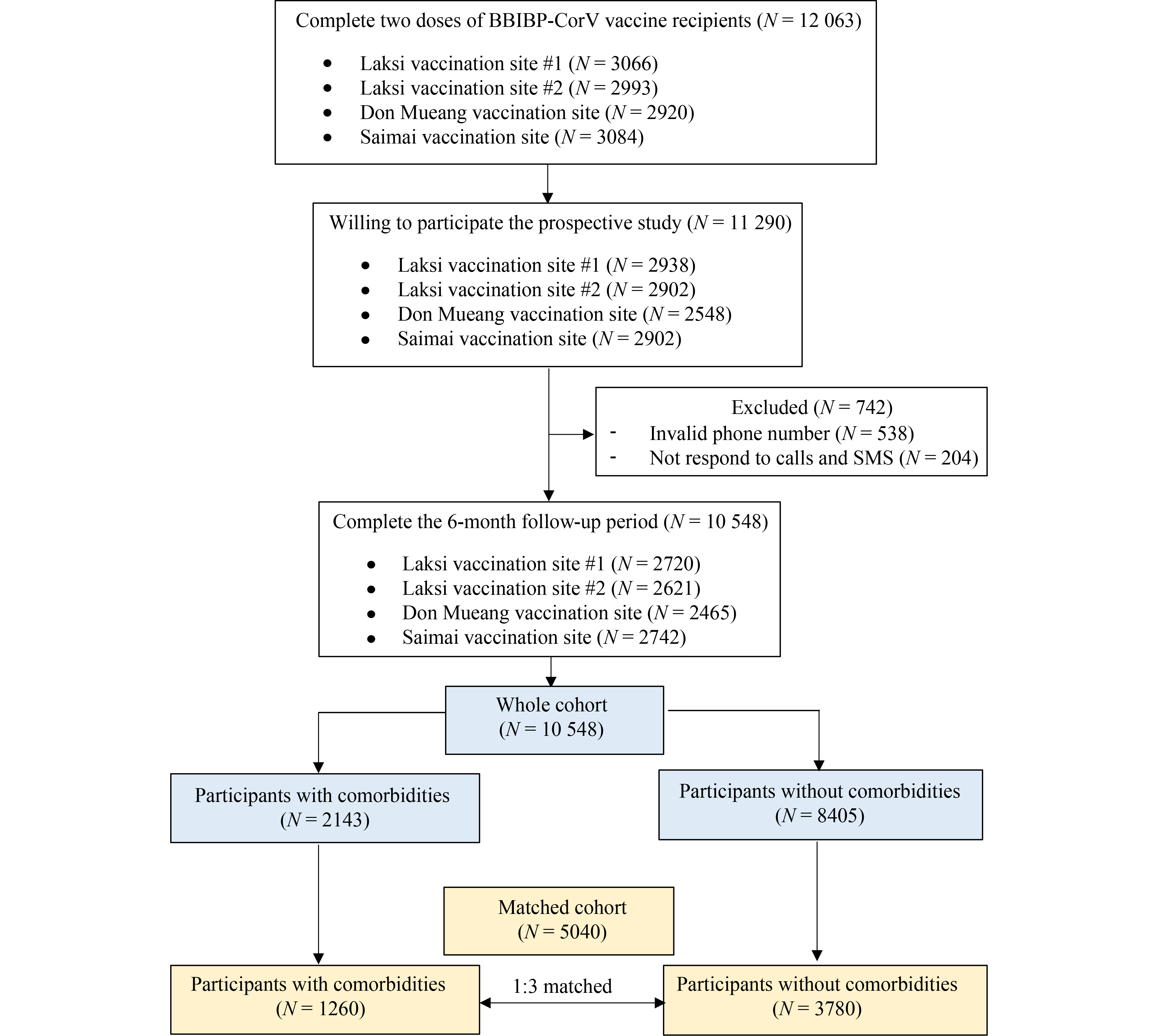 Protection against severe acute respiratory syndrome coronavirus 2 (SARS-CoV-2) infection of inactivated vaccines is not well characterized in people with comorbidities, who are at high risk of severe infection. We compared the risk of SARS-CoV-2 infection after complete vaccination with Sinopharm/BBIBP in people with comorbidities (e.g., autoimmune diseases, cardiovascular disease, chronic lung disease, and diabetes) with healthy individuals using a Cox-proportional hazard model. In July–September 2021, a total of 10 548 people (comorbidities, 2143; healthy, 8405) receiving the complete primary series of vaccination with Sinopharm/BBIBP in Bangkok, Thailand were prospectively followed for SARS-CoV-2 infection through text messaging and telephone interviewing for 6 months. A total of 295 infections from 284 participants were found. HRs (95% CI) of individuals with any comorbidities did not increase (unadjusted, 1.02 (0.77–1.36), P = 0.89; adjusted, 1.04 (0.78–1.38), P = 0.81). HRs significantly increased in the subgroup of autoimmune diseases (unadjusted, 2.64 (1.09–6.38), P = 0.032; adjusted, 4.45 (1.83–10.83), P = 0.001) but not in cardiovascular disease, chronic lung disease, or diabetes. The protection against SARS-CoV-2 infection of the Sinopharm vaccine was similar in participants with any comorbidities vs. healthy individuals. However, the protection appeared lower in the subgroup of autoimmune diseases, which may reflect suboptimal immune responses among these people.