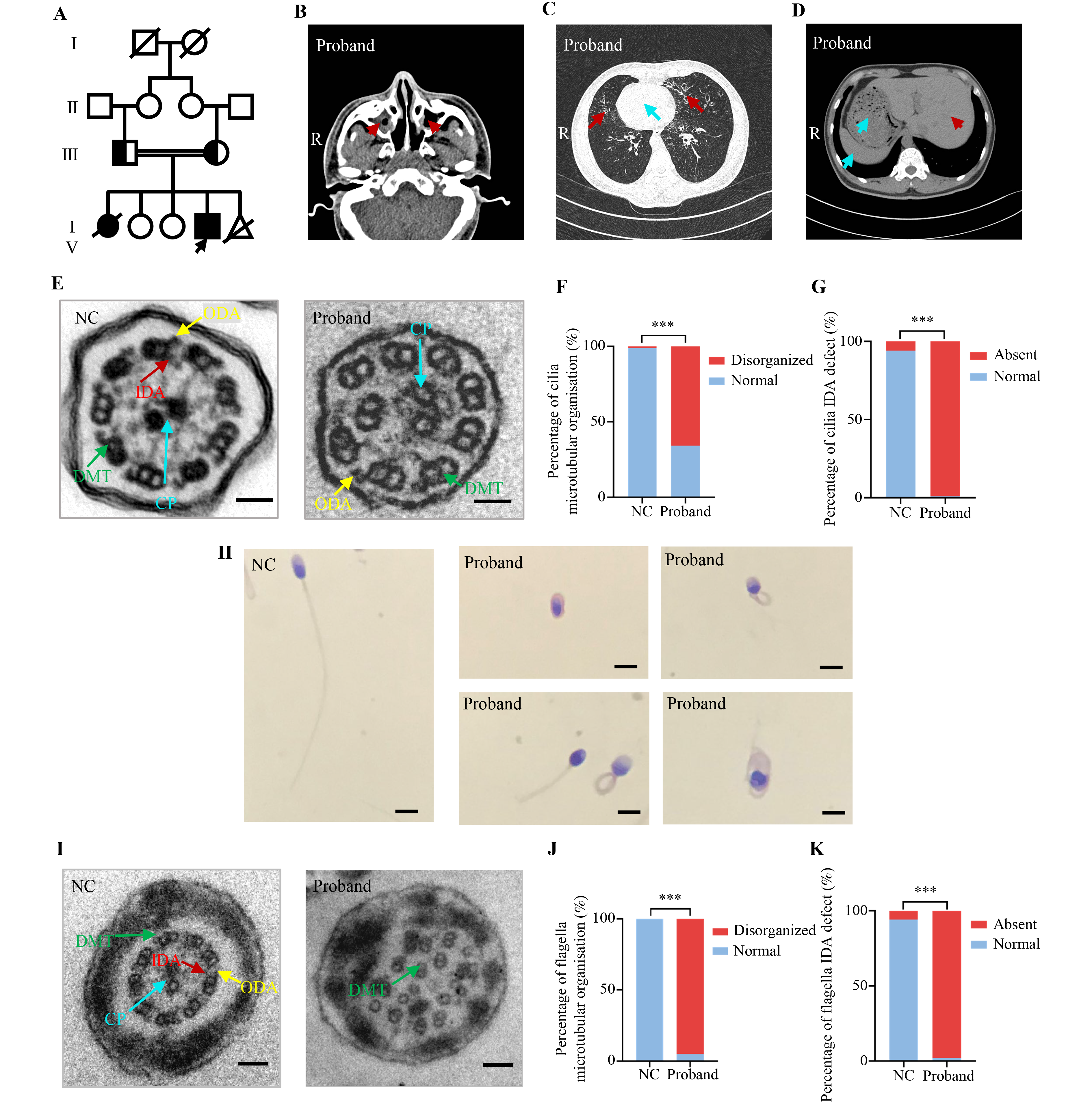 Primary ciliary dyskinesia (PCD) is a congenital, motile ciliopathy with pleiotropic symptoms. Although nearly 50 causative genes have been identified, they only account for approximately 70% of definitive PCD cases. Dynein axonemal heavy chain 10 (DNAH10) encodes a subunit of the inner arm dynein heavy chain in motile cilia and sperm flagella. Based on the common axoneme structure of motile cilia and sperm flagella, DNAH10 variants are likely to cause PCD. Using exome sequencing, we identified a novel DNAH10 homozygous variant (c.589C > T, p.R197W) in a patient with PCD from a consanguineous family. The patient manifested sinusitis, bronchiectasis, situs inversus, and asthenoteratozoospermia. Immunostaining analysis showed the absence of DNAH10 and DNALI1 in the respiratory cilia, and transmission electron microscopy revealed strikingly disordered axoneme 9+2 architecture and inner dynein arm defects in the respiratory cilia and sperm flagella. Subsequently, animal models of Dnah10-knockin mice harboring missense variants and Dnah10-knockout mice recapitulated the phenotypes of PCD, including chronic respiratory infection, male infertility, and hydrocephalus. To the best of our knowledge, this study is the first to report DNAH10 deficiency related to PCD in human and mouse models, which suggests that DNAH10 recessive mutation is causative of PCD.