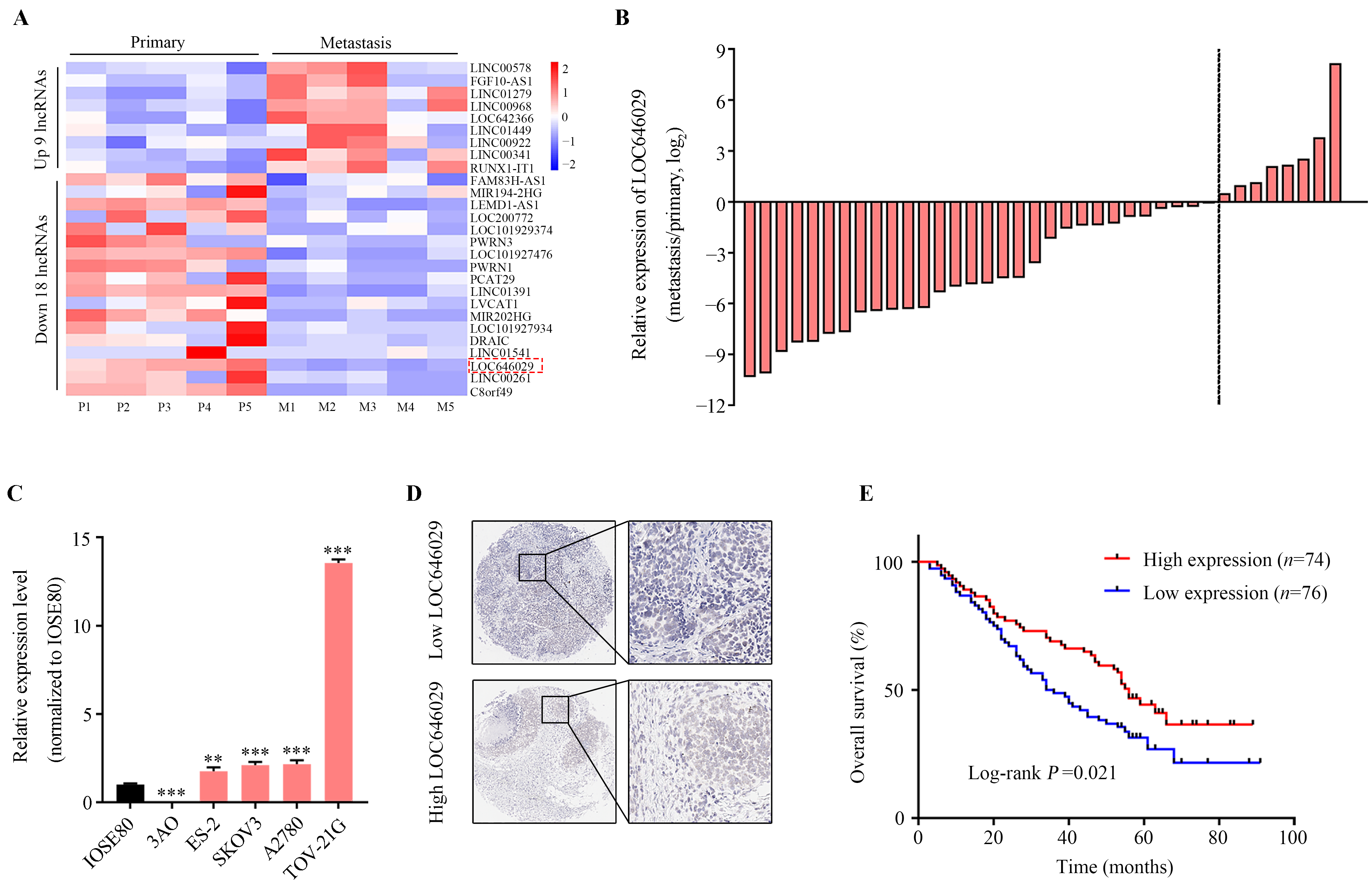 Long noncoding RNAs (lncRNAs) play a crucial regulatory role in the development and progression of multiple cancers. However, the potential mechanism by which lncRNAs affect the recurrence and metastasis of ovarian cancer remains unclear. In the current study, the lncRNA LOC646029 was markedly downregulated in metastatic ovarian tumors compared with primary tumors. Gain- and loss-of-function assays demonstrated that LOC646029 inhibits the proliferation, invasiveness, and metastasis of ovarian cancer cells in vivo and in vitro. Moreover, the downregulation of LOC646029 in metastatic ovarian tumors was strongly correlated with poor prognosis. Mechanistically, LOC646029 served as a miR-627-3p sponge to promote the expression of Sprouty-related EVH1 domain-containing protein 1, which is necessary for suppressing tumor metastasis and inhibiting KRAS signaling. Collectively, our results demonstrated that LOC646029 is involved in the progression and metastasis of ovarian cancer, which may be a potential prognostic biomarker.