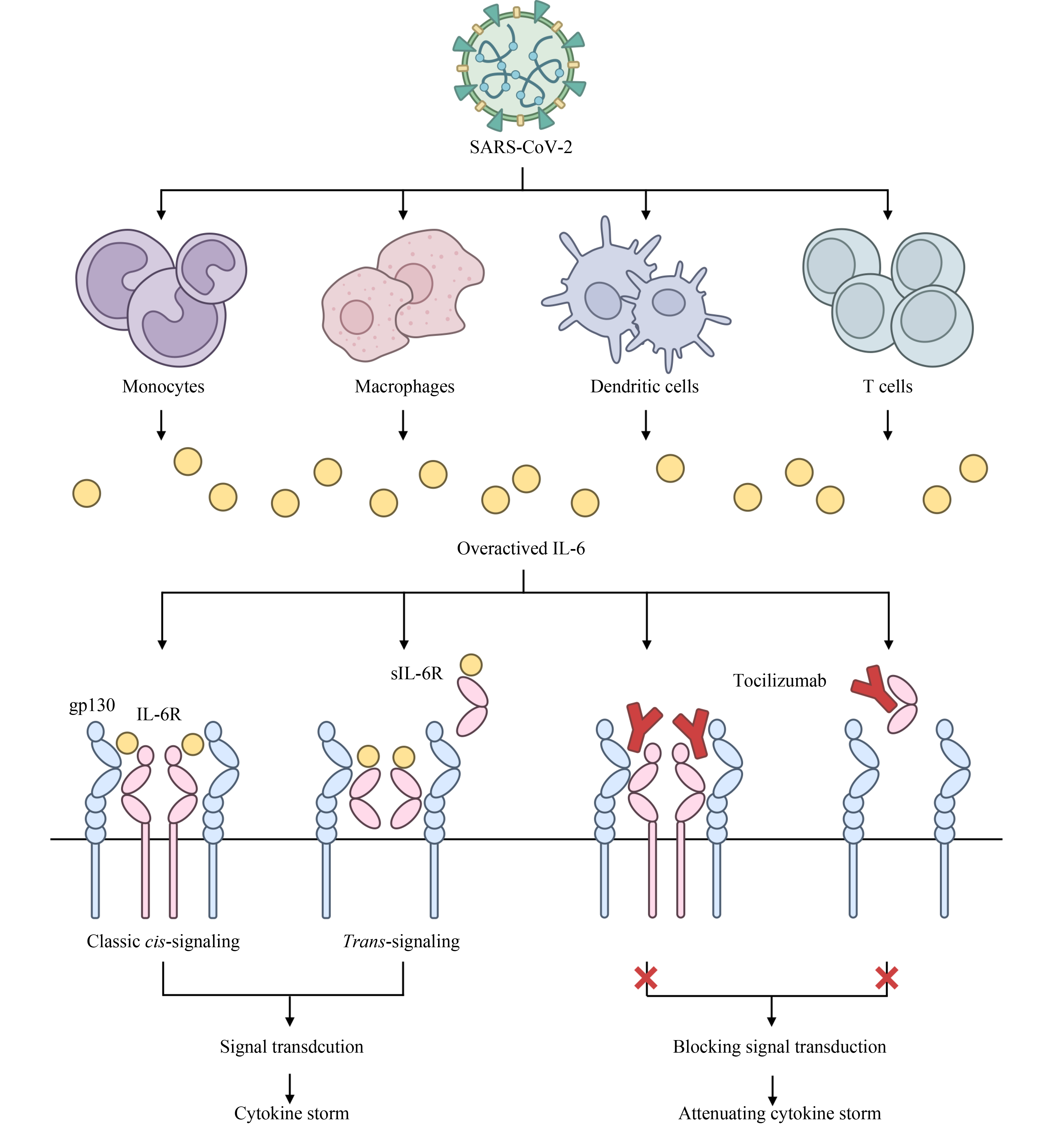 As of May 3, 2023, the coronavirus disease 2019 (COVID-19) pandemic has resulted in more than 760 million confirmed cases and over 6.9 million deaths. Several patients have developed pneumonia, which can deteriorate into acute respiratory distress syndrome. The primary etiology may be attributed to cytokine storm, which is triggered by the excessive release of proinflammatory cytokines and subsequently leads to immune dysregulation. Considering that high levels of interleukin-6 (IL-6) have been detected in several highly pathogenic coronavirus-infected diseases, such as severe acute respiratory syndrome in 2002, the Middle East respiratory syndrome in 2012, and COVID-19, the IL-6 pathway has emerged as a key in the pathogenesis of this hyperinflammatory state. Thus, we review the history of cytokine storm and the process of targeting IL-6 signaling to elucidate the pivotal role played by tocilizumab in combating COVID-19.