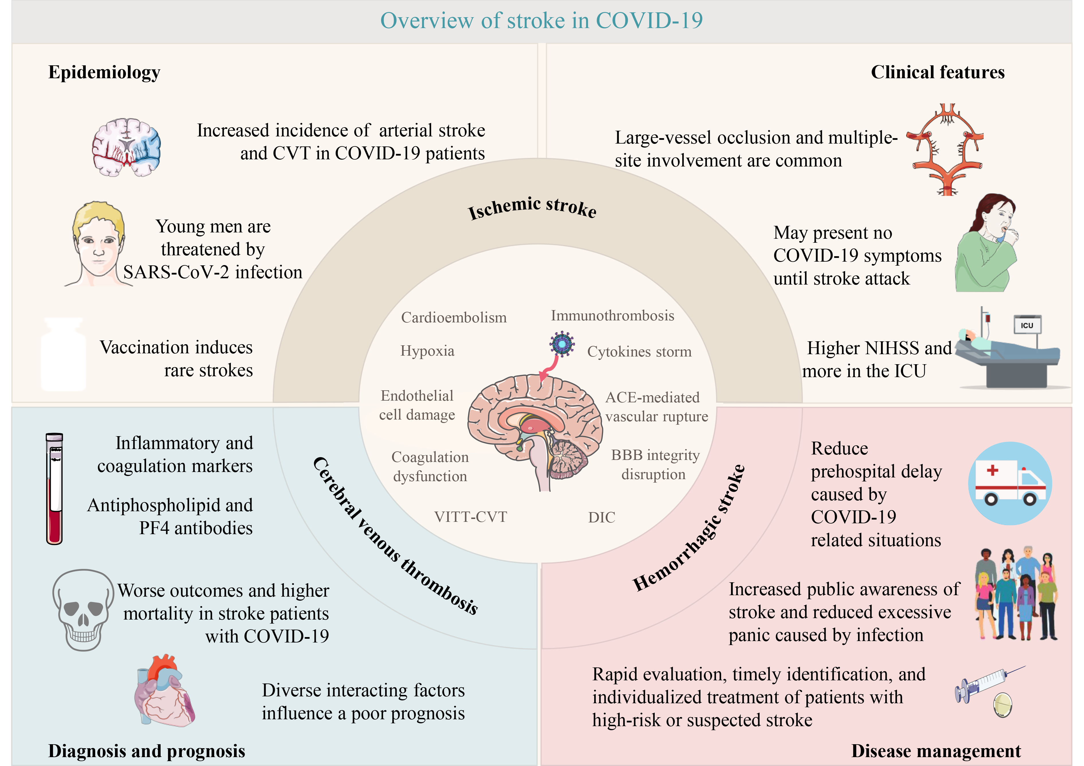 The coronavirus disease 2019 (COVID-19) epidemic has triggered a huge impact on healthcare, socioeconomics, and other aspects of the world over the past three years. An increasing number of studies have identified a complex relationship between COVID-19 and stroke, although active measures are being implemented to prevent disease transmission. Severe COVID-19 may be associated with an increased risk of stroke and increase the rates of disability and mortality, posing a serious challenge to acute stroke diagnosis, treatment, and care. This review aims to provide an update on the influence of COVID-19 itself or vaccines on stroke, including arterial stroke (ischemic stroke and hemorrhagic stroke) and venous stroke (cerebral venous thrombosis). Additionally, the neurovascular mechanisms involved in SARS-CoV-2 infection and the clinical characteristics of stroke in the COVID-19 setting are presented. Evidence on vaccinations, potential therapeutic approaches, and effective strategies for stroke management has been highlighted.