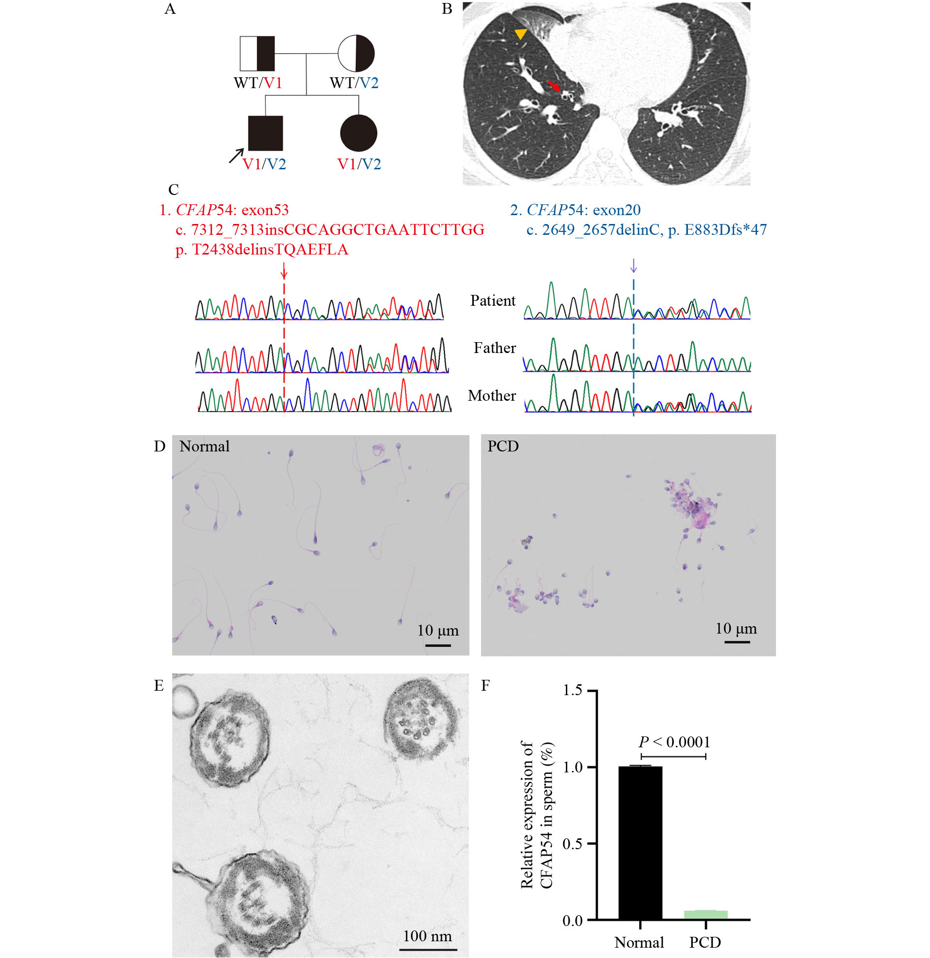 Primary ciliary dyskinesia (PCD) is a highly heterogeneous recessive inherited disorder. FAP54, the homolog of CFAP54 in Chlamydomonas reinhardtii, was previously demonstrated as the C1d projection of the central microtubule apparatus of flagella. A Cfap54 knockout mouse model was then reported to have PCD-relevant phenotypes. Through whole-exome sequencing, compound heterozygous variants c.2649_2657delinC (p. E883Dfs*47) and c.7312_7313insCGCAGGCTGAATTCTTGG (p. T2438delinsTQAEFLA) in a new suspected PCD-relevant gene, CFAP54, were identified in an individual with PCD. Two missense variants, c.4112A>C (p. E1371A) and c.6559C>T (p. P2187S), in CFAP54 were detected in another unrelated patient. In this study, a minigene assay was conducted on the frameshift mutation showing a reduction in mRNA expression. In addition, a CFAP54 in-frame variant knock-in mouse model was established, which recapitulated the typical symptoms of PCD, including hydrocephalus, infertility, and mucus accumulation in nasal sinuses. Correspondingly, two missense variants were deleterious, with a dramatic reduction in mRNA abundance from bronchial tissue and sperm. The identification of PCD-causing variants of CFAP54 in two unrelated patients with PCD for the first time provides strong supportive evidence that CFAP54 is a new PCD-causing gene. This study further helps expand the disease-associated gene spectrum and improve genetic testing for PCD diagnosis in the future.