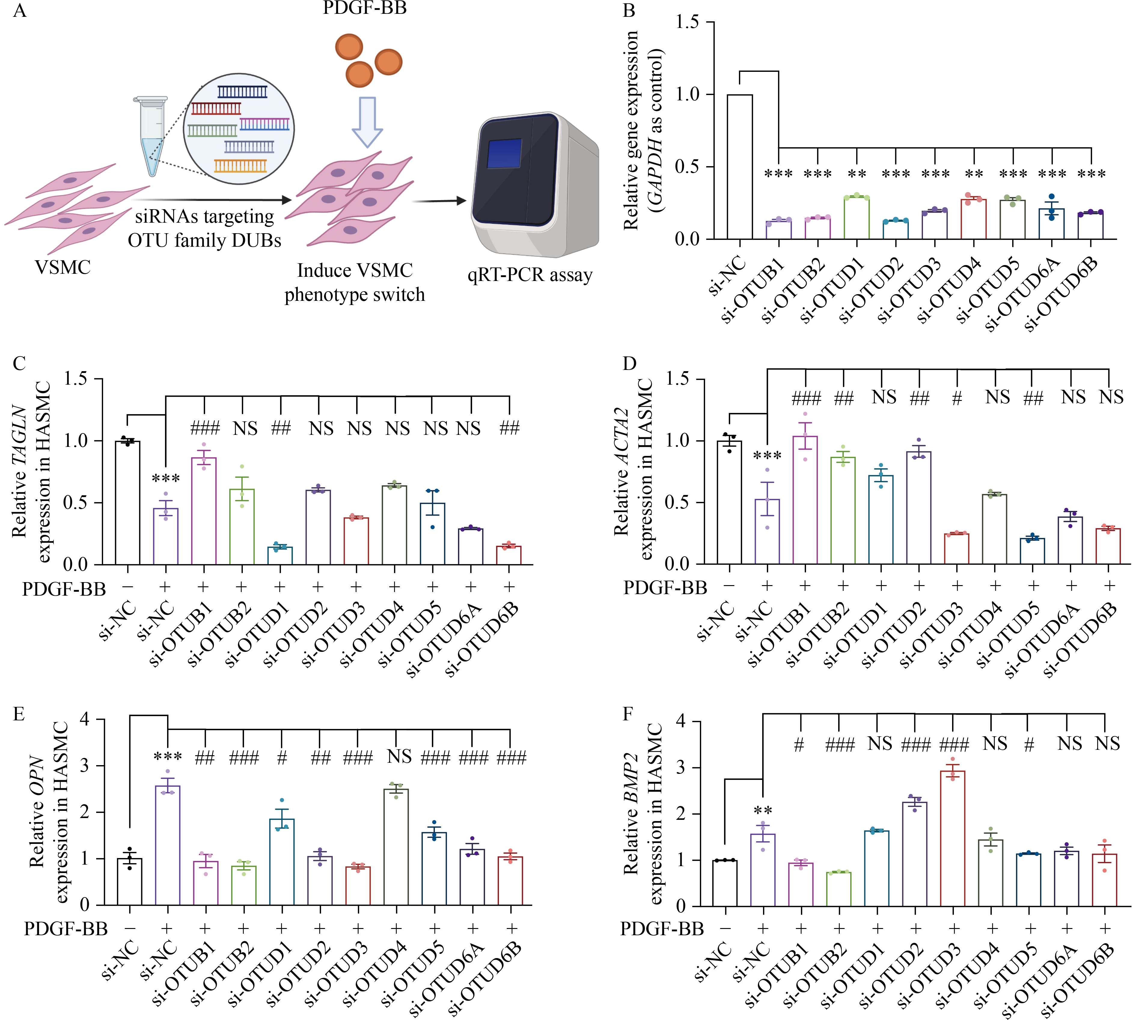 Atherosclerosis is a chronic artery disease that causes various types of cardiovascular dysfunction. Vascular smooth muscle cells (VSMCs), the main components of atherosclerotic plaque, switch from contractile to synthetic phenotypes during atherogenesis. Ubiquitylation is crucial in regulating VSMC phenotypes in atherosclerosis, and it can be reversely regulated by deubiquitinases. However, the specific effects of deubiquitinases on atherosclerosis have not been thoroughly elucidated. In this study, RNAi screening in human aortic smooth muscle cells was performed to explore the effects of OTU family deubiquitinases, which revealed that silencing OTUB1 inhibited PDGF-BB-stimulated VSMC phenotype switch. Further in vivo studies using Apoe−/− mice revealed that knockdown of OTUB1 in VSMCs alleviated atherosclerosis plaque burden in the advanced stage and led to a stable plaque phenotype. Moreover, VSMC proliferation and migration upon PDGF-BB stimulation could be inhibited by silencing OTUB1 in vitro. Unbiased RNA-sequencing data indicated that knocking down OTUB1 influenced VSMC differentiation, adhesion, and proliferation. Mass spectrometry of ubiquitinated protein confirmed that proteins related to cell growth and migration were differentially ubiquitylated. Mechanistically, we found that OTUB1 recognized the K707 residue ubiquitylation of PDGFRβ with its catalytic triad, thereby reducing the K48-linked ubiquitylation of PDGFRβ. Inhibiting OTUB1 in VSMCs could promote PDGFRβ degradation via the ubiquitin–proteasome pathway, so it was beneficial in preventing VSMCs’ phenotype switch. These findings revealed that knocking down OTUB1 ameliorated VSMCs’ phenotype switch and atherosclerosis progression, indicating that OTUB1 could be a valuable translational therapeutic target in the future.