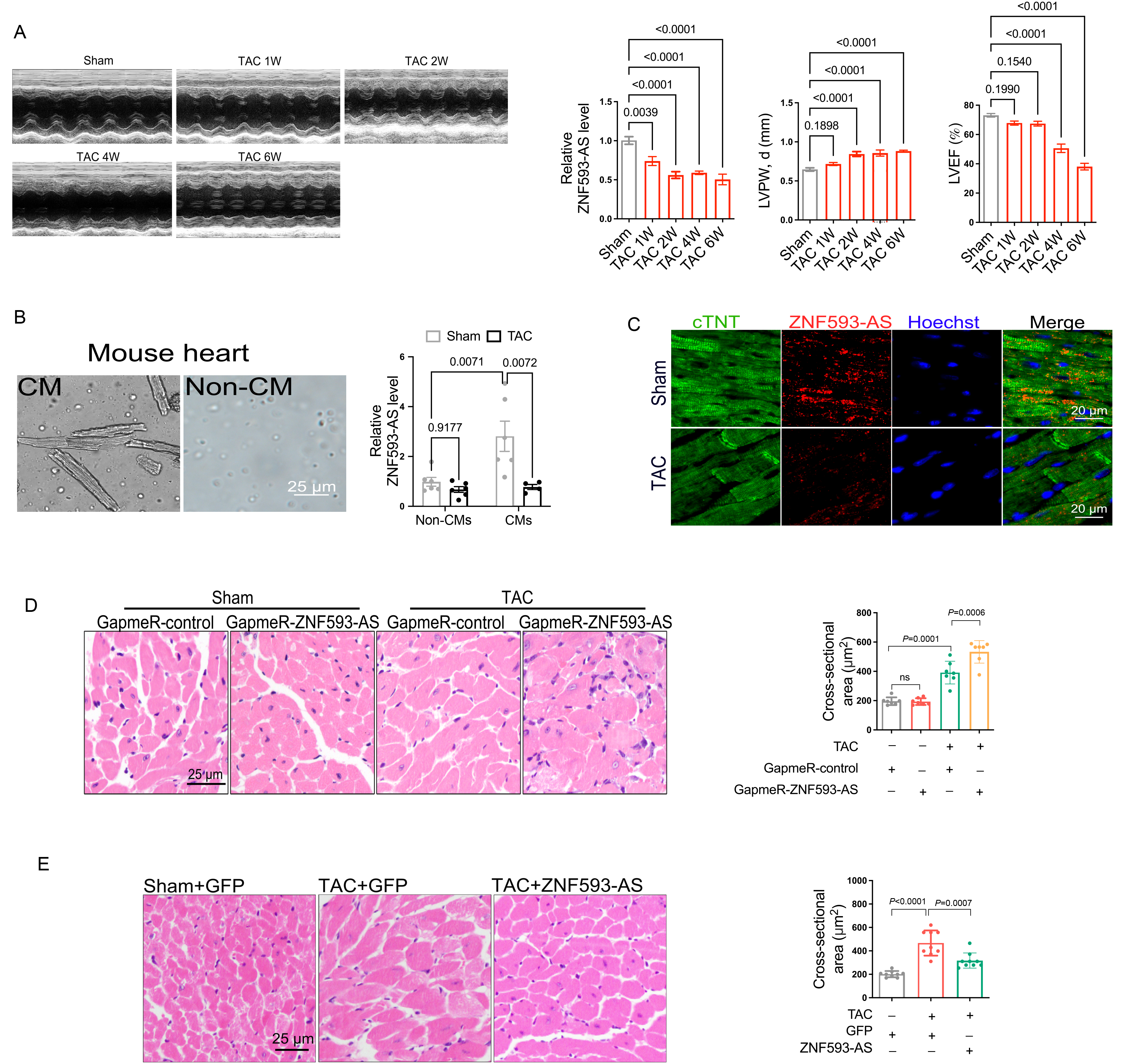 lncRNA ZNF593 antisense (ZNF593-AS) transcripts have been implicated in heart failure through the regulation of myocardial contractility. The decreased transcriptional activity of ZNF593-AS has also been detected in cardiac hypertrophy. However, the function of ZNF593-AS in cardiac hypertrophy remains unclear. Herein, we report that the expression of ZNF593-AS reduced in a mouse model of left ventricular hypertrophy and cardiomyocytes in response to treatment with the hypertrophic agonist phenylephrine (PE). In vivo, ZNF593-AS aggravated pressure overload–induced cardiac hypertrophy in knockout mice. By contrast, cardiomyocyte-specific transgenic mice (ZNF593-AS MHC-Tg) exhibited attenuated TAC-induced cardiac hypertrophy. In vitro, vector-based overexpression using murine or human ZNF593-AS alleviated PE-induced myocyte hypertrophy, whereas GapmeR-induced inhibition aggravated hypertrophic phenotypes. By using RNA-seq and gene set enrichment analyses, we identified a link between ZNF593-AS and oxidative phosphorylation and found that mitofusin 2 (Mfn2) is a direct target of ZNF593-AS. ZNF593-AS exerts an antihypertrophic effect by upregulating Mfn2 expression and improving mitochondrial function. Therefore, it represents a promising therapeutic target for combating pathological cardiac remodeling.
