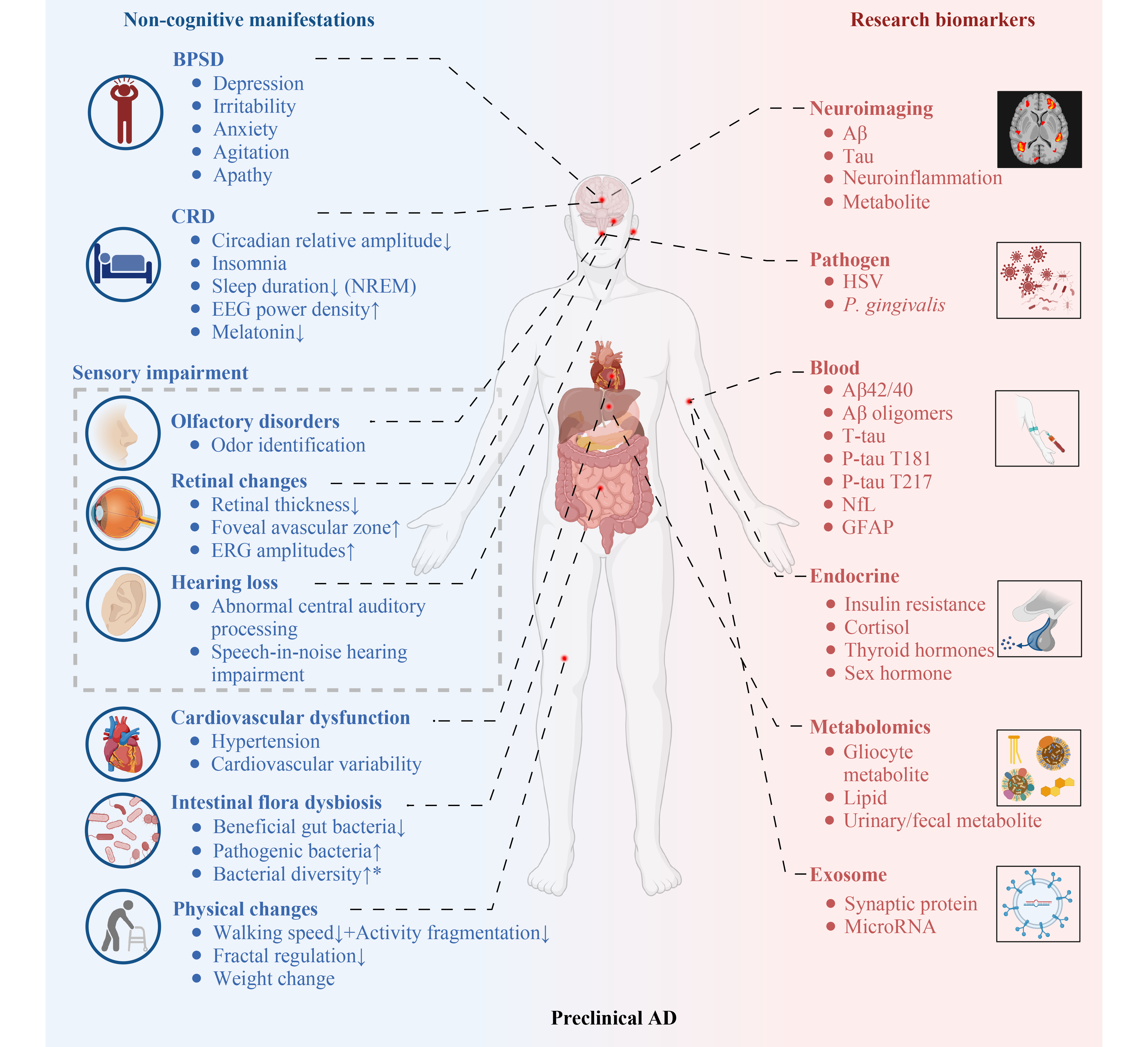 Alzheimer’s disease (AD) is a progressive neurodegenerative disorder that affects both cognition and non-cognition functions. The disease follows a continuum, starting with preclinical stages, progressing to mild cognitive and behavioral impairment, ultimately leading to dementia. Early detection of AD is crucial for better diagnosis and more effective treatment. However, the current AD diagnostic tests of biomarkers using cerebrospinal fluid and/or brain imaging are invasive or expensive, and mostly are still not able to detect early disease state. Consequently, there is an urgent need to develop new diagnostic techniques with higher sensitivity and specificity during the preclinical stages of AD. Various non-cognitive manifestations, including behavioral abnormalities, sleep disturbances, sensory dysfunctions, and physical changes, have been observed in the preclinical AD stage before occurrence of notable cognitive decline. Recent research advances have identified several biofluid biomarkers as early indicators of AD. This review focuses on these non-cognitive changes and newly discovered biomarkers in AD, specifically addressing the preclinical stages of the disease. Furthermore, it is of importance to explore the potential for developing a predictive system or network to forecast disease onset and progression at the early stage of AD.