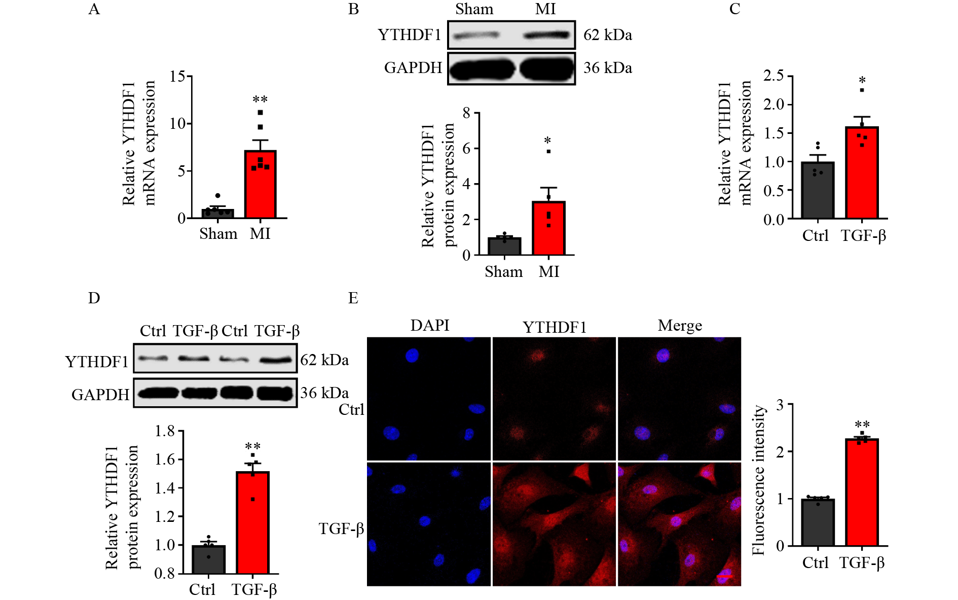 Cardiac fibrosis caused by ventricular remodeling and dysfunction such as post-myocardial infarction (MI) can lead to heart failure. RNA N6-methyladenosine (m6A) methylation has been shown to play a pivotal role in the occurrence and development of many illnesses. In investigating the biological function of the m6A reader YTHDF1 in cardiac fibrosis, adeno-associated virus 9 was used to knock down or overexpress the YTHDF1 gene in mouse hearts, and MI surgery in vivo and transforming growth factor-β (TGF-β)-activated cardiac fibroblasts in vitro were performed to establish fibrosis models. Our results demonstrated that silencing YTHDF1 in mouse hearts can significantly restore impaired cardiac function and attenuate myocardial fibrosis, whereas YTHDF1 overexpression could further enhance cardiac dysfunction and aggravate the occurrence of ventricular pathological remodeling and fibrotic development. Mechanistically, zinc finger BED-type containing 6 mediated the transcriptional function of the YTHDF1 gene promoter. YTHDF1 augmented AXL translation and activated the TGF-β-Smad2/3 signaling pathway, thereby aggravating the occurrence and development of cardiac dysfunction and myocardial fibrosis. Consistently, our data indicated that YTHDF1 was involved in activation, proliferation, and migration to participate in cardiac fibrosis in vitro. Our results revealed that YTHDF1 could serve as a potential therapeutic target for myocardial fibrosis.