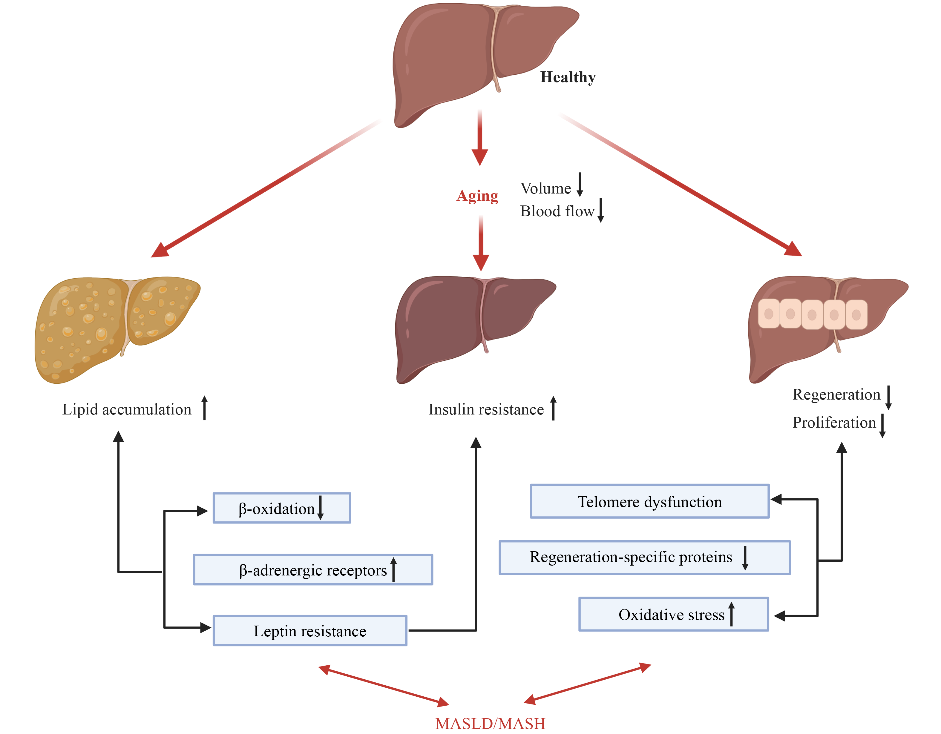 In recent years, aging and cellular senescence have triggered an increased interest in corresponding research fields. Evidence shows that the complex aging process is involved in the development of many chronic liver diseases, such as metabolic dysfunction-associated steatotic liver disease (MASLD) and metabolic dysfunction-associated steatohepatitis (MASH). In fact, aging has a tremendous effect on the liver, leading to a gradual decline in the metabolism, detoxification and immune functions of the liver, which in turn increases the risk of liver disease. These changes can be based on the aging of liver cells (hepatocytes, liver sinusoidal endothelial cells, hepatic stellate cells, and Kupffer cells). Similarly, patients with liver diseases exhibit increases in the aging phenotype and aging cells, often manifesting as faster physical functional decline, which is closely related to the promoting effect of liver disease on aging. This review summarizes the interplay between MASLD/MASH development and aging, aiming to reveal the complex relationships that exacerbate one another. Moreover, the corresponding schemes for delaying aging or treating diseases are discussed to provide a basis for the development of effective prevention and treatment strategies in the future.