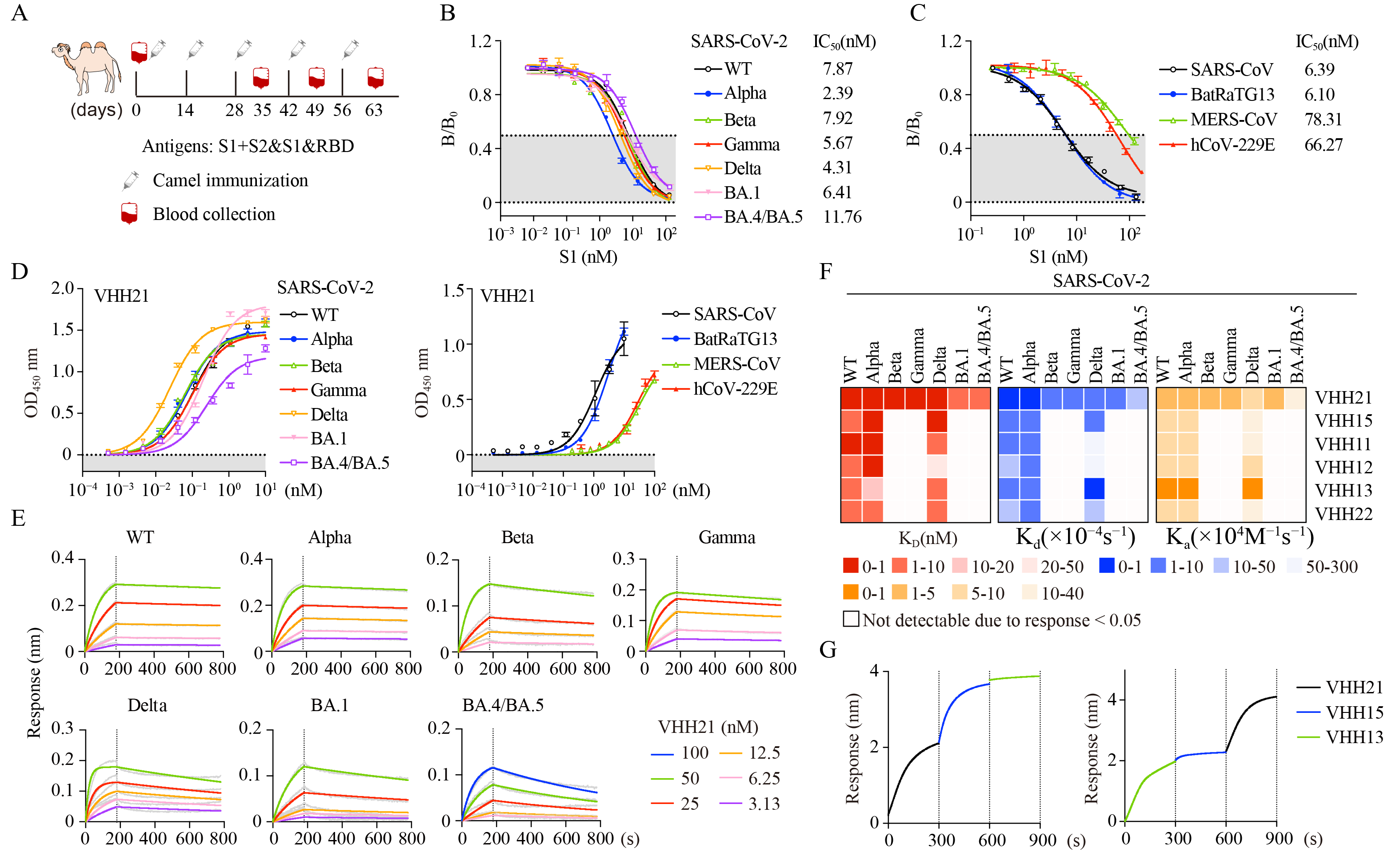 Neutralizing antibodies have been designed to specifically target and bind to the receptor binding domain (RBD) of spike (S) protein to block severe acute respiratory syndrome coronavirus 2 (SARS-CoV-2) virus from attaching to angiotensin converting enzyme 2 (ACE2). This study reports a distinctive nanobody, designated as VHH21, that directly catalyzes the S-trimer into an irreversible transition state through postfusion conformational changes. Derived from camels immunized with multiple antigens, a set of nanobodies with high affinity for the S1 protein displays abilities to neutralize pseudovirion infections with a broad resistance to variants of concern of SARS-CoV-2, including SARS-CoV and BatRaTG13. Importantly, a super-resolution screening and analysis platform based on visual fluorescence probes was designed and applied to monitor single proteins and protein subunits. A spontaneously occurring dimeric form of VHH21 was obtained to rapidly destroy the S-trimer. Structural analysis via cryogenic electron microscopy revealed that VHH21 targets specific conserved epitopes on the S protein, distinct from the ACE2 binding site on the RBD, which destabilizes the fusion process. This research highlights the potential of VHH21 as an abzyme-like nanobody (nanoabzyme) possessing broad-spectrum binding capabilities and highly effective anti-viral properties and offers a promising strategy for combating coronavirus outbreaks.