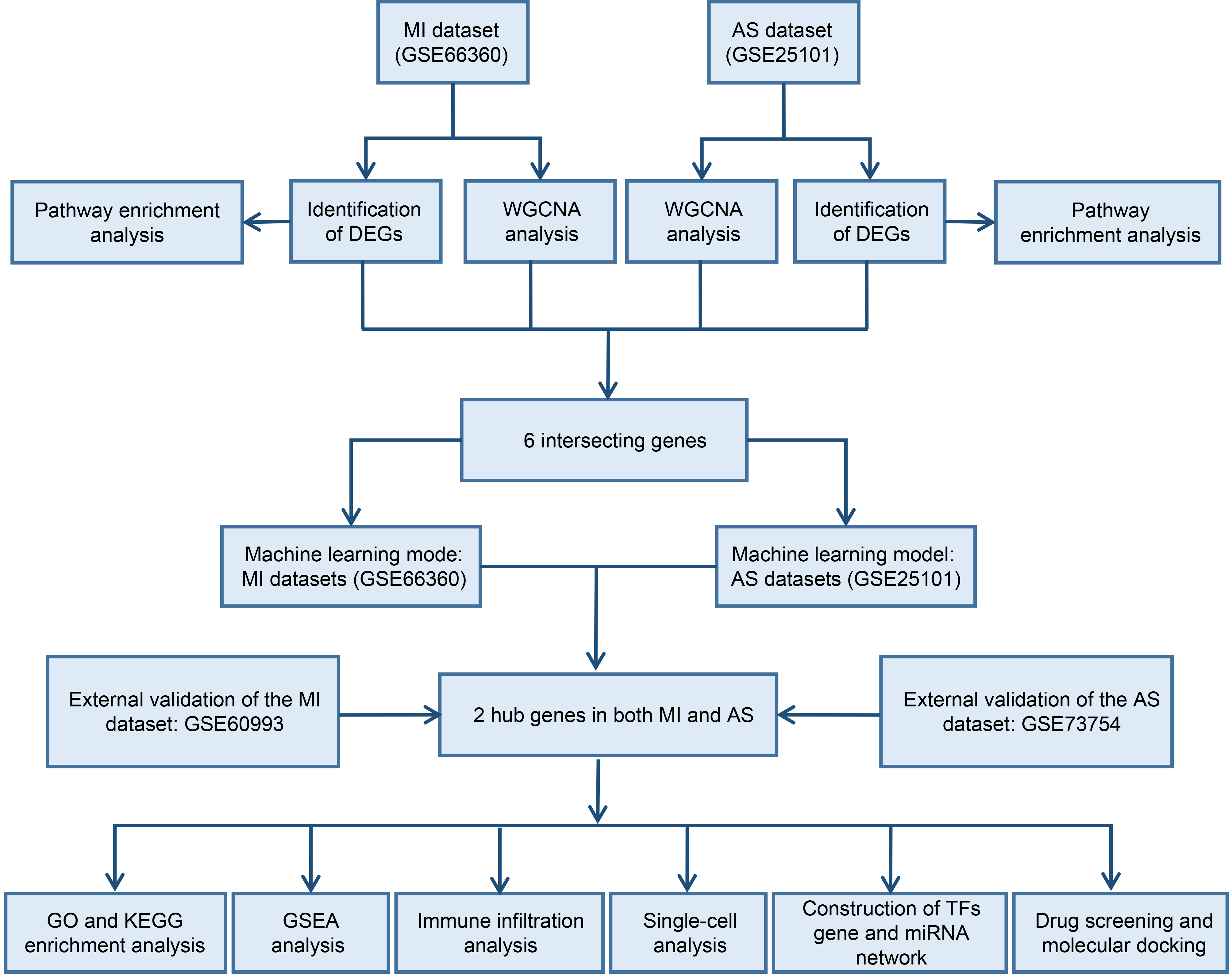 Ankylosing spondylitis (AS) is linked to an increased prevalence of myocardial infarction (MI). However, research dedicated to elucidating the pathogenesis of AS-MI is lacking. In this study, we explored the biomarkers for enhancing the diagnostic and therapeutic efficiency of AS-MI. Datasets were obtained from the Gene Expression Omnibus database. We employed weighted gene co-expression network analysis and machine learning models to screen hub genes. A receiver operating characteristic curve and a nomogram were designed to assess diagnostic accuracy. Gene set enrichment analysis was conducted to reveal the potential function of hub genes. Immune infiltration analysis indicated the correlation between hub genes and the immune landscape. Subsequently, we performed single-cell analysis to identify the expression and subcellular localization of hub genes. We further constructed a transcription factor (TF)-microRNA (miRNA) regulatory network. Finally, drug prediction and molecular docking were performed. S100A12 and MCEMP1 were identified as hub genes, which were correlated with immune-related biological processes. They exhibited high diagnostic value and were predominantly expressed in myeloid cells. Furthermore, 24 TFs and 9 miRNA were associated with these hub genes. Enzastaurin, meglitinide, and nifedipine were predicted as potential therapeutic agents. Our study indicates that S100A12 and MCEMP1 exhibit significant potential as biomarkers and therapeutic targets for AS-MI, offering novel insights into the underlying etiology of this condition.