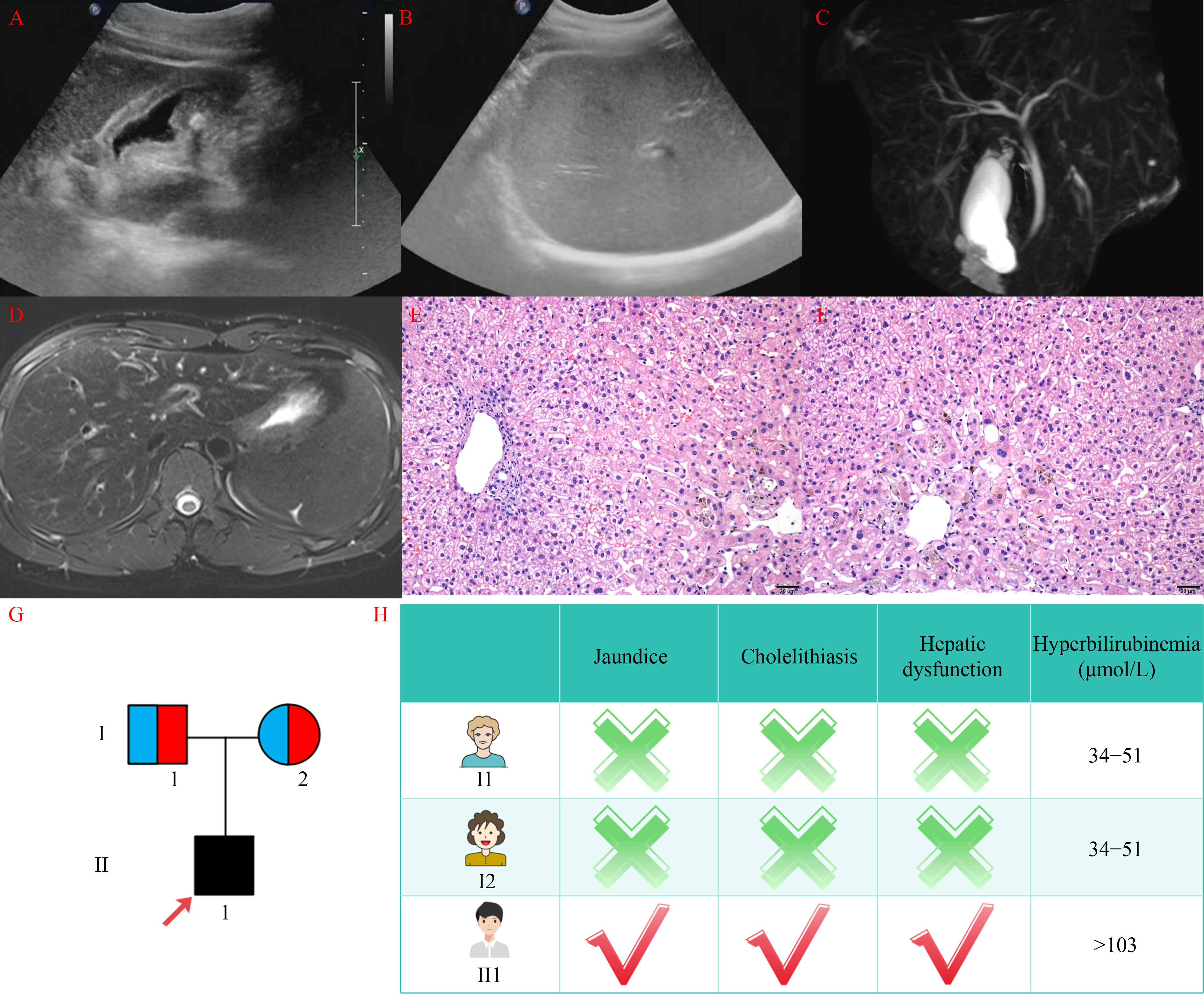 Crigler-Najjar syndrome (CNS) and Gilbert syndrome (GS; OMIM: 143500) are rare autosomal recessive diseases that cause unconjugated hyperbilirubinemia due to decreased UGT1A1 enzyme activity. Crigler-Najjar syndrome type 2 (CNS2; OMIM: 606785) increases the risk of gallbladder stone formation and cholecystitis, while GS seldom causes health issues. We found a 28-year-old male patient with recurring right upper abdomen pain who experienced persistent jaundice from birth. CNS2 with gallbladder stones and cholecystitis was diagnosed after genetic testing revealed rare double homozygous mutations A(TA)7TAA (rs3064744) and P229Q (rs35350960) in the UGT1A1 gene. After pedigree investigation, we found that the patient’s parents with modestly increased bilirubin had compound heterozygous mutations A(TA)7TAA and P229Q, which were GS. Bioinformatics analysis showed that A(TA)7TAA is in the TATA-box region of the gene UGT1A1 promoter, affecting gene transcriptional initiation, whereas P229Q modifies protein three-dimensional structure and may be harmful. In this pedigree, double homozygous mutations have a more severe phenotype than compound heterozygous mutations. Inherited causes of hyperbilirubinemia should be suspected after ruling out biliary obstruction, and early bilirubin reduction (< 103 μmol/L (6 mg/dL)) may reduce the risk of complications like cholecystitis in CNS2 patients, though further studies with longer follow-up are needed to confirm this observation.