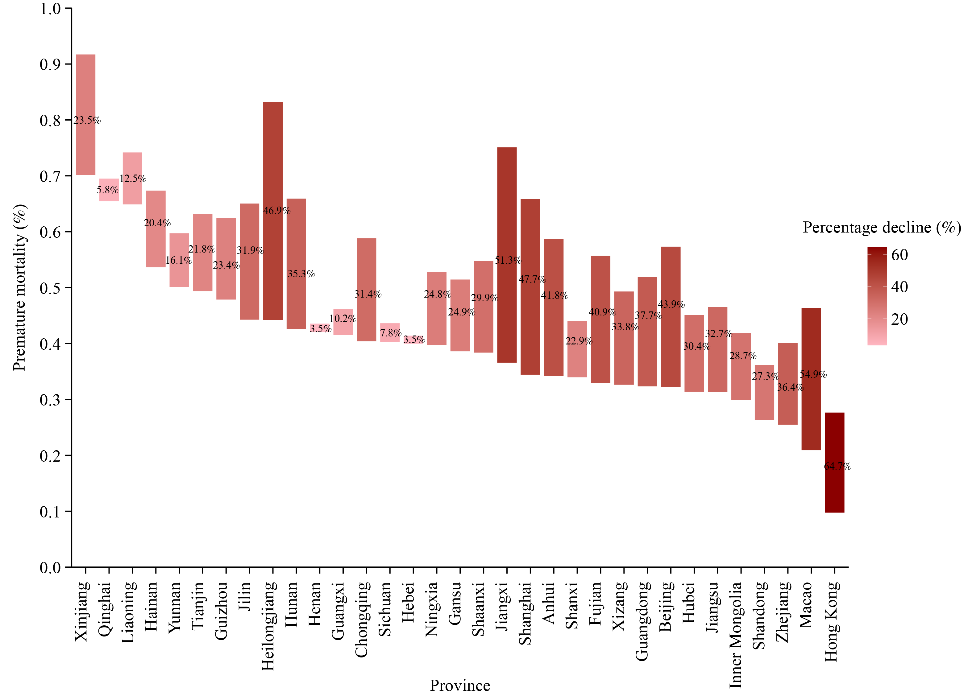 The Healthy China 2030 Plan set the goal of reducing premature deaths from diabetes by 30% by 2030. However, there has been a lack of assessment of premature mortality for diabetes since the action plan was issued. This study used data from the Global Burden of Disease Study 2021, calculated the premature deaths for diabetes by sex, provinces, and subtypes from 1990 to 2021. We explored the temporal trend of premature mortality using the average annual percent change (AAPC) for different sexes, provinces, and subtypes from 1990 to 2021. Furthermore, we predicted premature mortality for diabetes through 2030 for China and its provinces according to the average annual change rate from 2010 to 2021. There was a first slow upward trend in premature mortality for diabetes from 0.5% in 1990 to 0.6% in 2004, and then a decline until 2021 with premature mortality of 0.4%. By 2030, only Fujian (30.3%) will achieve the desired level of reduction, with only seven provinces meeting the target for females and none for males. There is a large range in the degree of decline between inland and coastal regions, showing obvious geographic differences, and there should be a focus on balancing medical resources.