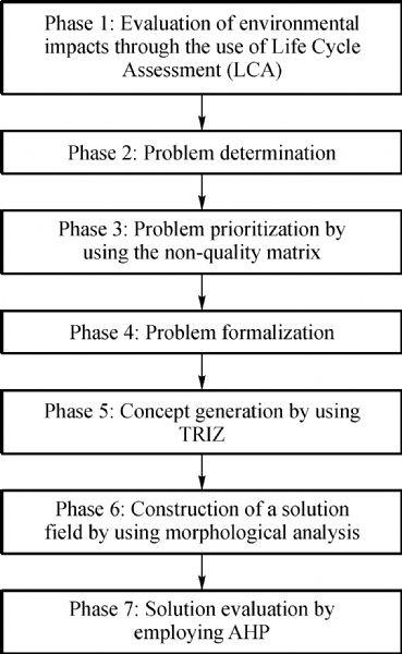 This study proposes an eco-innovative design process taking into consideration quality and environmental aspects in prioritizing and solving technical engineering problems. This approach provides a synergy between the Life Cycle Assessment (LCA), the non-quality matrix, the Theory of Inventive Problem Solving (TRIZ), morphological analysis and the Analytical Hierarchy Process (AHP). In the sequence of these tools, LCA assesses the environmental impacts generated by the system. Then, for a better consideration of environmental aspects, a new tool is developed, the non-quality matrix, which defines the problem to be solved first from an environmental point of view. The TRIZ method allows the generation of new concepts and contradiction resolution. Then, the morphological analysis offers the possibility of extending the search space of solutions in a design problem in a systematic way. Finally, the AHP identifies the promising solution(s) by providing a clear logic for the choice made. Their usefulness has been demonstrated through their application to a case study involving a centrifugal spreader with spinning discs.