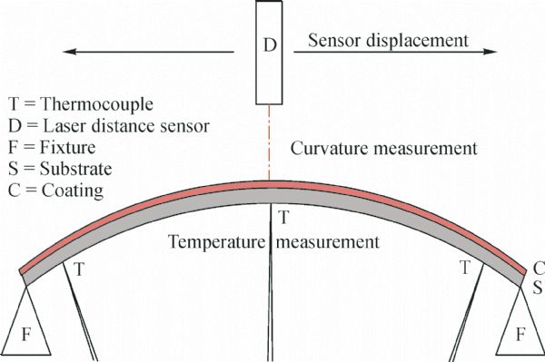 The elastic modulus of a deposit (Ed) can be obtained by monitoring the temperature (∆T) and curvature (∆k) of a one-side coated long plate, namely, a one-dimensional (1D) deformation model. The aim of this research is to design an experimental setup that proves whether a 1D deformation model can be scaled for complex geometries. The setup includes a laser displacement sensor mounted on a robotic arm capable of scanning a specimen surface and measuring its deformation. The reproducibility of the results is verified by comparing the present results with Stony Brook University Laboratory’s results. The ∆k-∆T slope error is less than 8%, and the Ed estimation error is close to 2%. These values reveal the repeatability of the experiments. Several samples fabricated with aluminum as the substrate and 100MXC nanowire (Fe and Cr alloy) as the deposit are analyzed and compared with those in finite element (FE) simulations. The linear elastic behavior of 1D (flat long plate) and 2D (squared plate) specimens during heating/cooling cycles is demonstrated by the high linearity of all ∆k-∆T curves (over 97%). The Ed values are approximately equal for 1D and 2D analyses, with a median of 96 GPa and standard deviation of 2 GPa. The correspondence between the experimental and simulated results for the 1D and 2D specimens reveals that deformation and thermal stress in coated specimens can be predicted regardless of specimen geometry through FE modeling and by using the experimental value of Ed. An example of a turbine-blade-shaped substrate is presented to validate the approach.