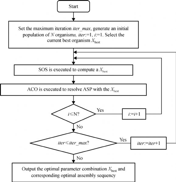 As an important part of product design and manufacturing, assembly sequence planning (ASP) has a considerable impact on product quality and manufacturing costs. ASP is a typical NP-complete problem that requires effective methods to find the optimal or near-optimal assembly sequence. First, multiple assembly constraints and rules are incorporated into an assembly model. The assembly constraints and rules guarantee to obtain a reasonable assembly sequence. Second, an algorithm called SOS-ACO that combines symbiotic organisms search (SOS) and ant colony optimization (ACO) is proposed to calculate the optimal or near-optimal assembly sequence. Several of the ACO parameter values are given, and the remaining ones are adaptively optimized by SOS. Thus, the complexity of ACO parameter assignment is greatly reduced. Compared with the ACO algorithm, the hybrid SOS-ACO algorithm finds optimal or near-optimal assembly sequences in fewer iterations. SOS-ACO is also robust in identifying the best assembly sequence in nearly every experiment. Lastly, the performance of SOS-ACO when the given ACO parameters are changed is analyzed through experiments. Experimental results reveal that SOS-ACO has good adaptive capability to various values of given parameters and can achieve competitive solutions.