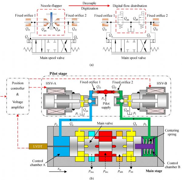 Pilot two-stage proportional valves are widely used in high-power hydraulic systems. For the purpose of improving the dynamic performance, reliability, and digitization of the traditional proportional valve, a novel two-stage proportional valve with a pilot digital flow distribution is proposed from the viewpoint of the dual nozzle-flapper valve’s working principle. In particular, the dual nozzle-flapper is decoupled by two high-speed on/off valves (HSVs). First, the working principle and mathematical model of the proposed valve are determined. Then, the influences of the control parameters (duty cycle and switching frequency) and structural parameters (fixed orifice’s diameter and main valve’s spring) on the main valve’s motion are analyzed on the basis of theory, simulation, and experiment. In addition, in optimizing the value of the fixed orifice’s diameter, a new design criterion that considers the maximum pressure sensitivity, flow controllability, and flow linearization is proposed to improve the balance between the effective displacement and the displacement fluctuation of the main valve. The new scheme is verified by simulations and experiments. Experimental results of the closed-loop displacement tracking have demonstrated that the delay time of the main valve is always within 3.5 ms under different working conditions, and the tracking error can be significantly reduced using the higher switching frequency. The amplitude–frequency experiments indicate that a −3 dB-frequency of the proposed valve can reach 9.5 Hz in the case of ±50% full scale and 15 Hz in the case of 0%–50% full scale. The values can be further improved by increasing the flow rate of the pilot HSV.