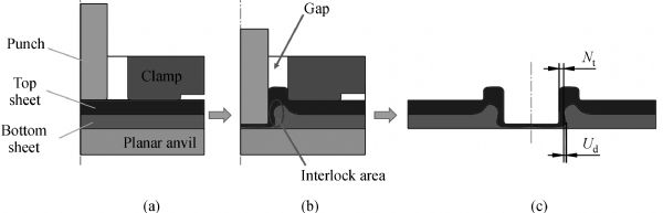 The flat clinching process is attracting a growing attention in the joining field of lightweight materials because it avoids the geometric protrusion that appears in the conventional clinching process. In this paper, the effects of sheet thickness and material on the mechanical properties of the clinched joint were studied. Al1060 and Al2024 sheets with 2 mm thickness were employed to develop the clinched joint by using different material configurations, and Al1060 sheets with 2.5- and 1.5-mm thicknesses were used to produce the clinched joint by using different thickness configurations. The clinched joints using various sheet configurations were sectioned, and dimensional analysis was conducted. Cross-tensile and shearing tests were carried out to analyze the mechanical properties of the clinched joint, including tensile strength, shearing strength, and absorbed energy. In addition, the failure modes of the clinched joints were discussed. Results indicated that the clinched joint with a stiff top sheet had increased static strength regardless of the test type. The clinched joint with a thick top sheet demonstrated lower static strength than the joint with a thick bottom sheet in the cross-tensile test. However, this result was reversed in the shearing tests. The flat clinching process has a great potential in joining dissimilar and various thickness materials.