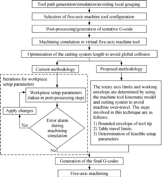 The machining industry must maximize the machine tool utilization for its efficient and effective usage. Determining a feasible workpiece location is one of the significant tasks performed in an iterative way via machining simulations. The maximum utilization of five-axis machine tools depends upon the cutting system’s geometry, the configuration of the machine tool, and the workpiece’s location. In this research, a mathematical model has been developed to determine the workpiece’s feasible location in the five-axis machine tool for avoiding the number of iterations, which are usually performed to eliminate the global collision and axis limit errors. In this research, a generic arrangement of the five-axis machine tool has been selected. The mathematical model of post-processor has been developed by using kinematic modeling methods. The machine tool envelopes have been determined using the post-processor and axial limit. The tooltip reachable workspace is determined by incorporating the post-processor, optimal cutting system length, and machining envelope, thereby further developing an algorithm to determine the feasible workpiece setup parameters accurately. The algorithm’s application has been demonstrated using an example. Finally, the algorithm is validated for feasible workpiece setup parameters in a virtual environment. This research is highly applicable in the industry to eliminate the number of iterations performed for the suitable workpiece setup parameters.