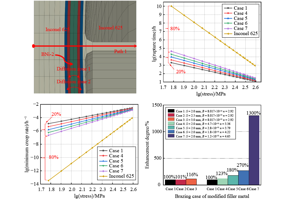 The creep life of an aeroengine recuperator is investigated in terms of continuum damage mechanics by using finite element simulations. The effects of the manifold wall thickness and creep properties of brazing filler metal on the operating life of the recuperator are analyzed. Results show that the crack initiates from the brazing filler metal located on the outer surface of the manifold with the wall thickness of 2 mm and propagates throughout the whole region of the brazing filler metal when the creep time reaches 34900 h. The creep life of the recuperator meets the requirement of 40000 h continuous operation when the wall thickness increases to 3.5 mm, but its total weight increases by 15%. Decreasing the minimum creep strain rate with the enhancement of the creep strength of the brazing filler metal presents an obvious effect on the creep life of the recuperator. At the same stress level, the creep rupture time of the recuperator is enhanced by 13 times if the mismatch between the minimum creep rate of the filler and base metal is reduced by 20%.