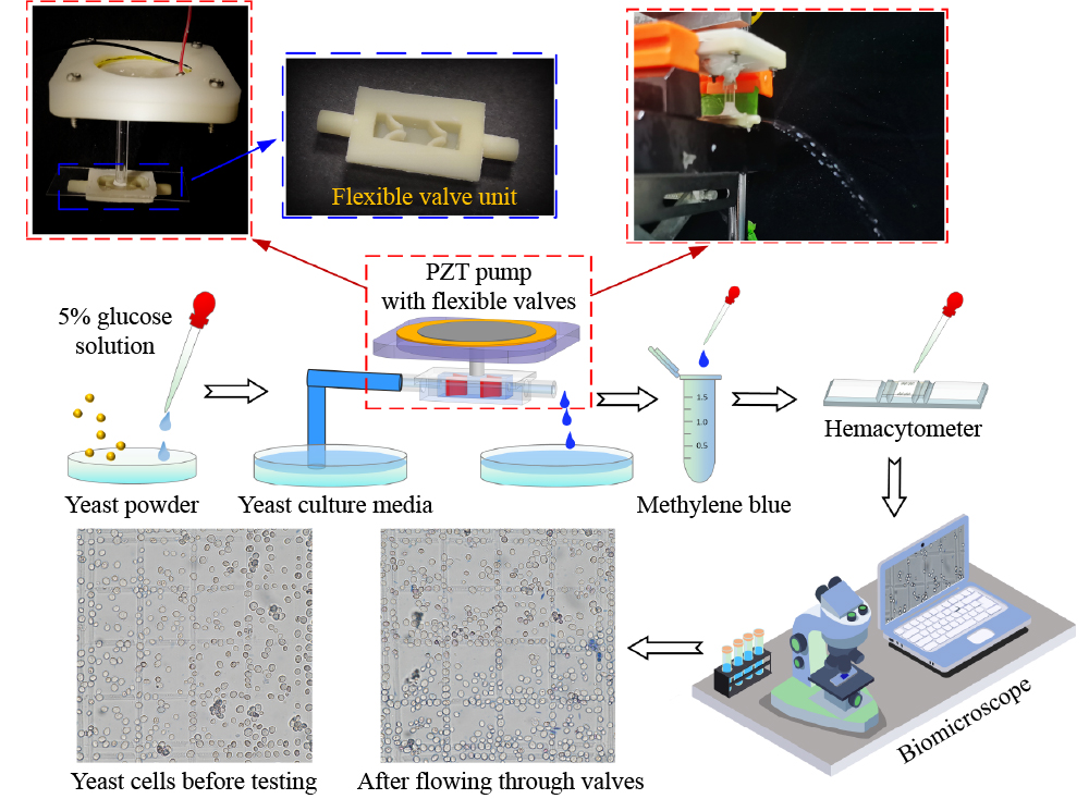 The development of organ-on-a-chip systems demands high requirements for adequate micro-pump performance, which needs excellent performance and effective transport of active cells. In this study, we designed a piezoelectric pump with a flexible venous valve inspired by that of humans. Performance test of the proposed pump with deionized water as the transmission medium shows a maximum output flow rate of 14.95 mL/min when the input voltage is 100 V, and the pump can transfer aqueous solutions of glycerol with a viscosity of 10.8 mPa·s. Cell survival rate can reach 97.22% with a yeast cell culture solution as the transmission medium. A computational model of the electric-solid-liquid multi-physical field coupling of the piezoelectric pump with a flexible venous valve is established, and simulation results are consistent with experimental results. The proposed pump can help to construct the circulating organ-on-a-chip system, and the simple structure and portable application can enrich the design of microfluidic systems. In addition, the multi-physical field coupling computational model established for the proposed piezoelectric pump can provide an in-depth study of the characteristics of the flow field, facilitating the optimal design of the micro-pump and providing a reference for the further study of active cell transport in organ-on-a-chip systems.