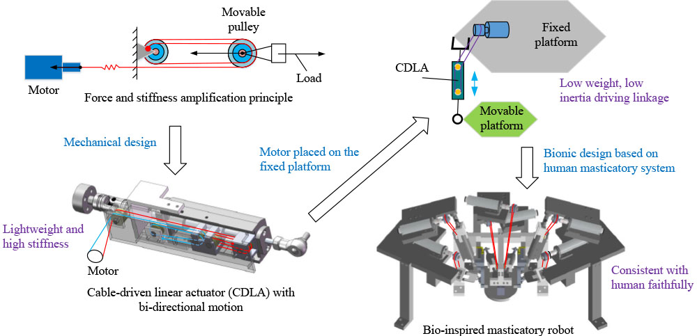 Masticatory robots are an effective in vitro performance testing device for dental material and mandibular prostheses. A cable-driven linear actuator (CDLA) capable of bidirectional motion is proposed in this study to design a masticatory robot that can achieve increasingly human-like chewing motion. The CDLA presents remarkable advantages, such as lightweight and high stiffness structure, in using cable amplification and pulley systems. This work also exploits the proposed CDLA and designs a masticatory robot called Southeast University masticatory robot (SMAR) to solve existing problems, such as bulky driving linkage and position change of the muscle’s origin. Stiffness analysis and performance experiment validate the CDLA’s efficiency, with its stiffness reaching 1379.6 N/mm (number of cable parts n = 4), which is 21.4 times the input wire stiffness. Accordingly, the CDLA’s force transmission efficiencies in two directions are 84.5% and 85.9%. Chewing experiments are carried out on the developed masticatory robot to verify whether the CDLA can help SMAR achieve a natural human-like chewing motion and sufficient chewing forces for potential applications in performance tests of dental materials or prostheses.